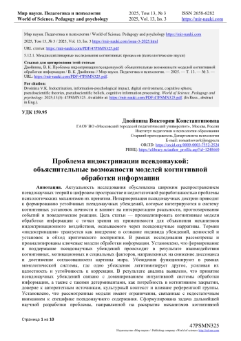 Цель статьи - проанализировать когнитивные модели обработки информации с точки зрения их применимости для объяснения механизмов индоктринационного воздействия, оказываемого через псевдонаучные нарративы. Термин «индоктринация» трактуется как внедрение в сознание индивида убеждений, ценностей и установок в обход критического восприятия. В рамках исследования рассмотрены и проанализированы ключевые модели обработки информации. Установлено, что формирование и поддержание псевдонаучных убеждений происходит в результате взаимодействия когнитивных, мотивационных и социальных факторов, направленных на снижение диссонанса и достижение согласованности картины мира. Убеждения функционируют в рамках монологической системы, где одно убеждение легитимизирует другое, усиливая их целостность и устойчивость к коррекции.