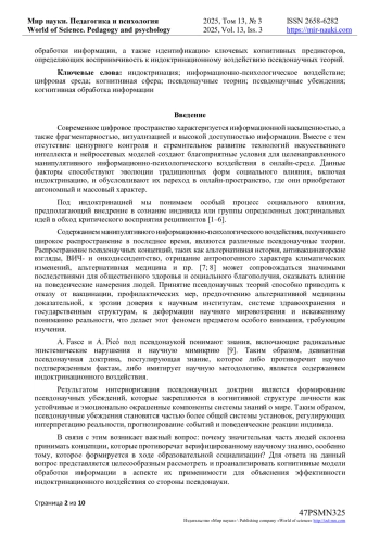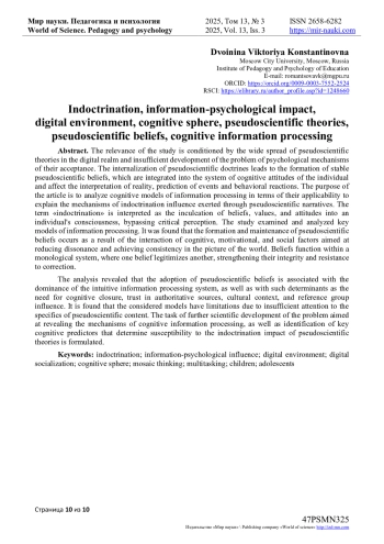 Актуальность исследования обусловлена широким распространением псевдонаучных теорий в цифровом пространстве и недостаточной разработанностью проблемы психологических механизмов их принятия. Интериоризация псевдонаучных доктрин приводит к формированию устойчивых псевдонаучных убеждений, которые интегрируются в систему когнитивных установок личности и влияют на интерпретацию реальности, прогнозирование событий и поведенческие реакции.
