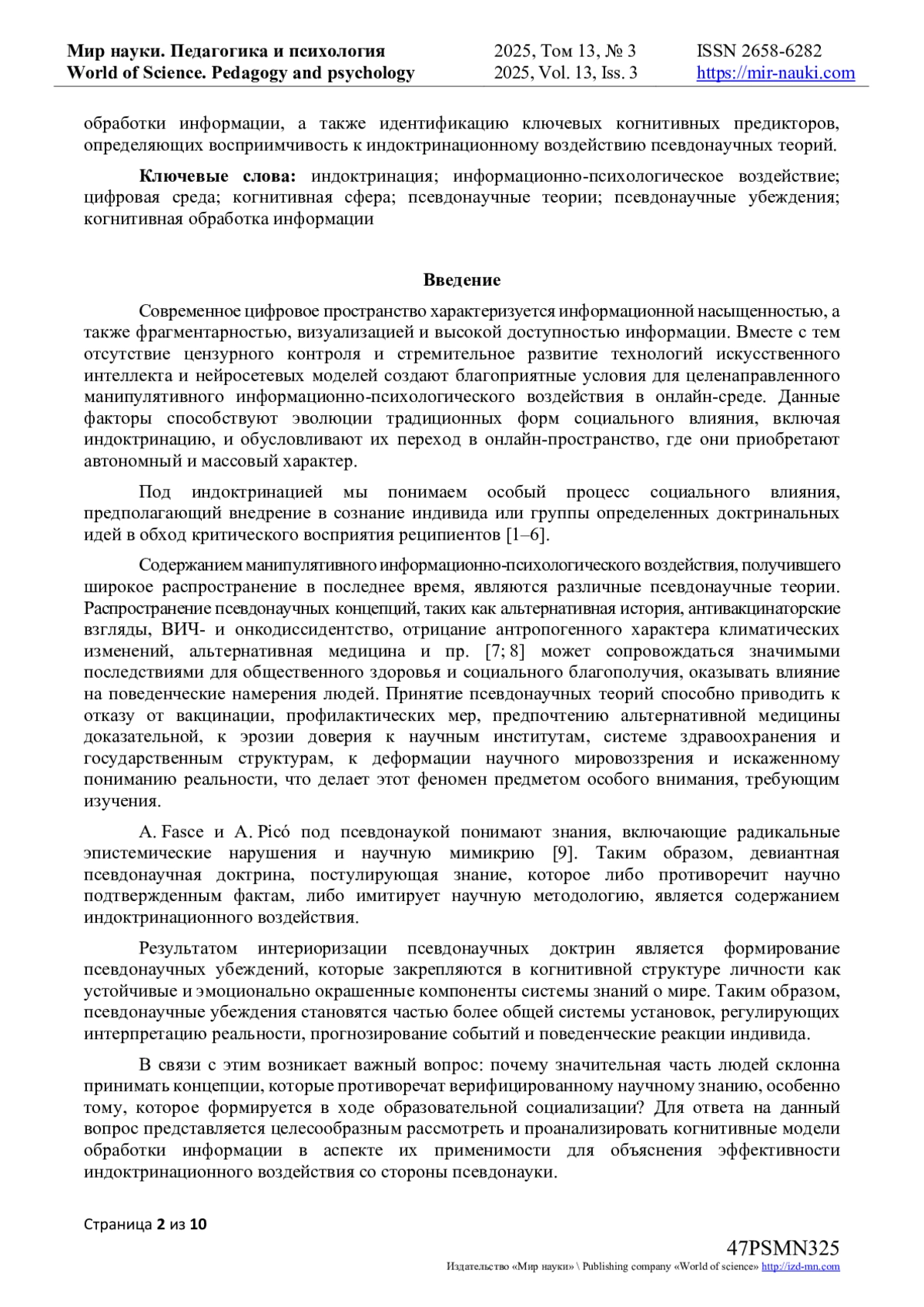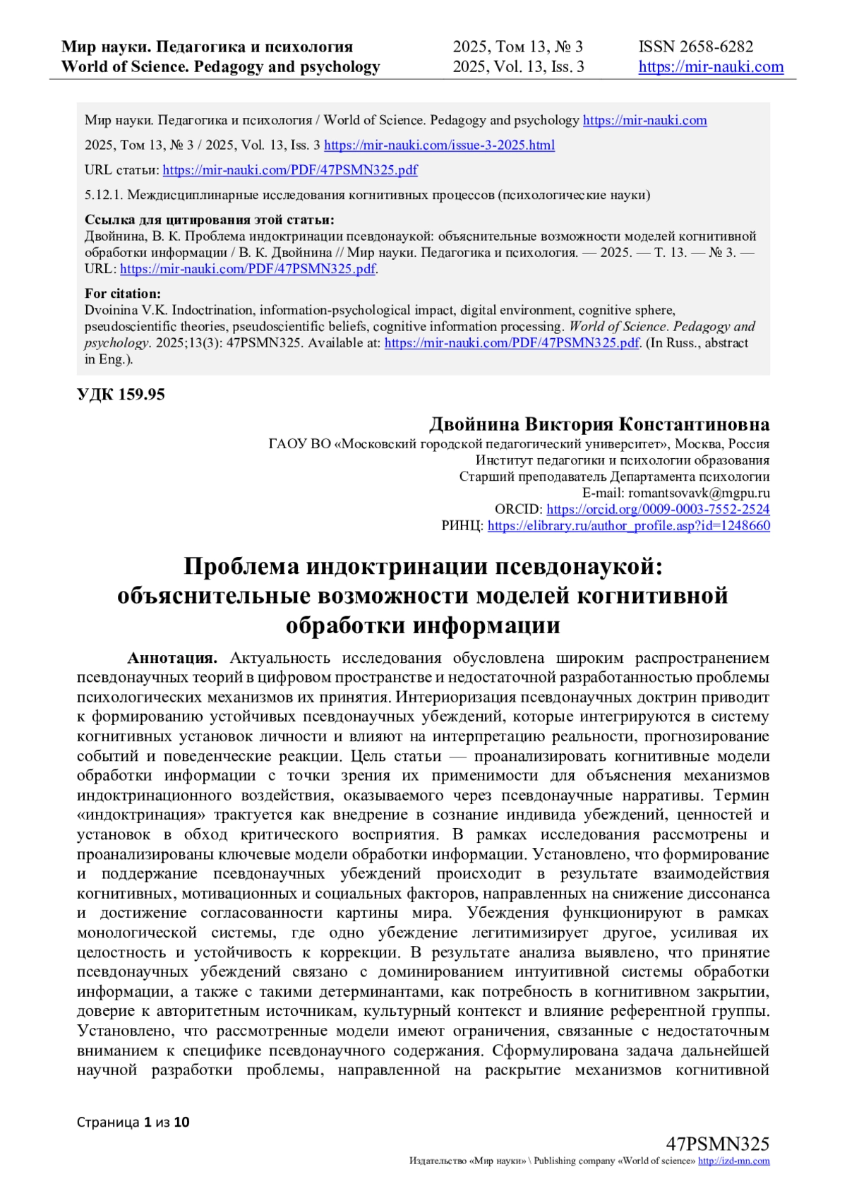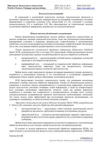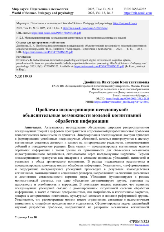 В результате анализа выявлено, что принятие псевдонаучных убеждений связано с доминированием интуитивной системы обработки информации, а также с такими детерминантами, как потребность в когнитивном закрытии, доверие к авторитетным источникам, культурный контекст и влияние референтной группы. Установлено, что рассмотренные модели имеют ограничения, связанные с недостаточным вниманием к специфике псевдонаучного содержания. Сформулирована задача дальнейшей научной разработки проблемы, направленной на раскрытие механизмов когнитивной обработки информации, а также идентификацию ключевых когнитивных предикторов, определяющих восприимчивость к индоктринационному воздействию псевдонаучных теорий.