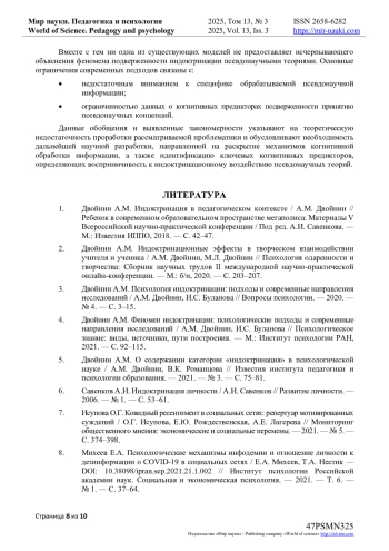 5. Двойнин А.М. О содержании категории “индоктринация” в психологической науке / А.М. Двойнин, В.К. Романцова // Известия института педагогики и психологии образования. - 2021. - № 3. - С. 75-81. EDN: XQMMCG