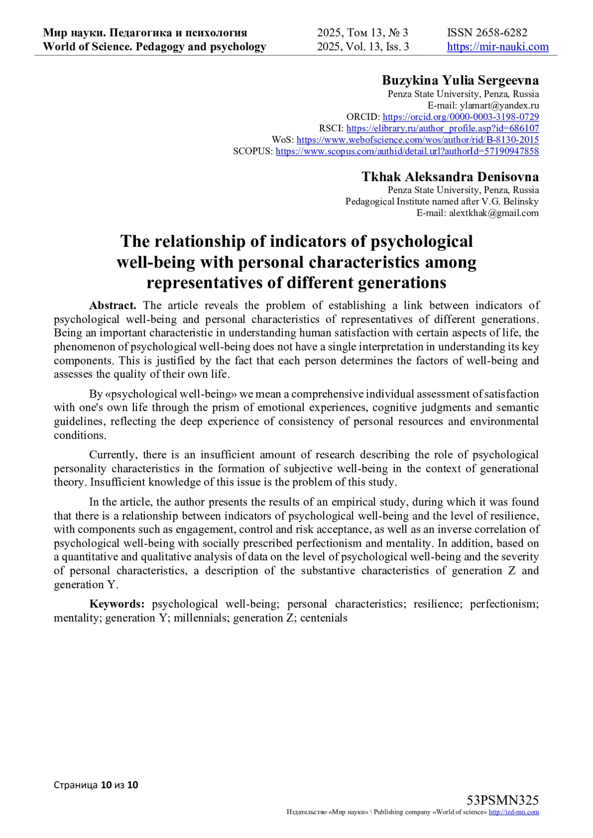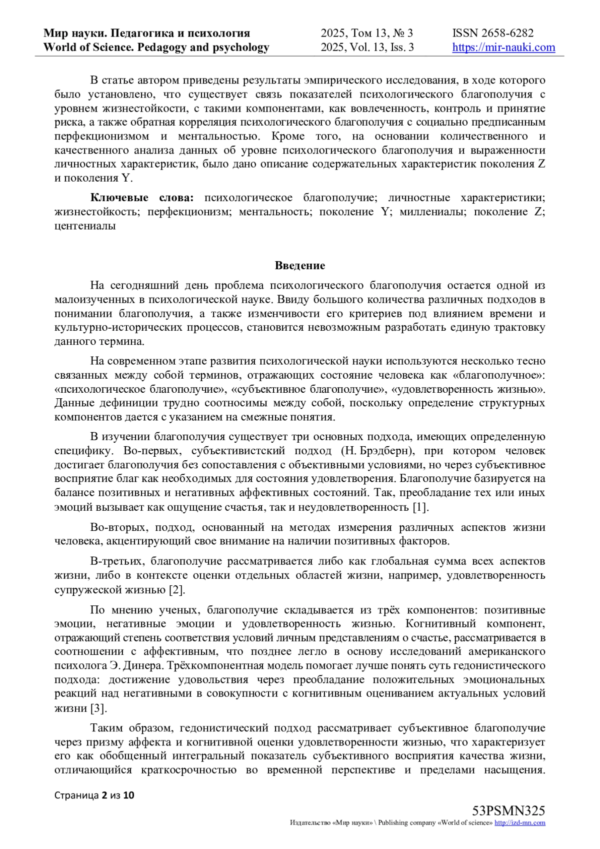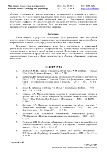 В статье автором приведены результаты эмпирического исследования, в ходе которого было установлено, что существует связь показателей психологического благополучия с уровнем жизнестойкости, с такими компонентами, как вовлеченность, контроль и принятие риска, а также обратная корреляция психологического благополучия с социально предписанным перфекционизмом и ментальностью. Кроме того, на основании количественного и качественного анализа данных об уровне психологического благополучия и выраженности личностных характеристик, было дано описание содержательных характеристик поколения Z и поколения Y.
