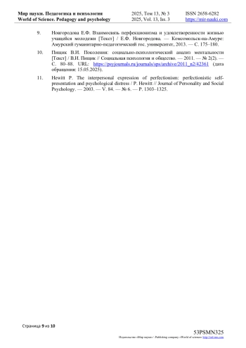 9. Новгородова Е.Ф. Взаимосвязь перфекционизма и удовлетворенности жизнью учащейся молодежи [Текст] / Е.Ф. Новгородова. - Комсомольск-на-Амуре: Амурский гуманитарно-педагогический гос. университет, 2013. - С. 175-180.