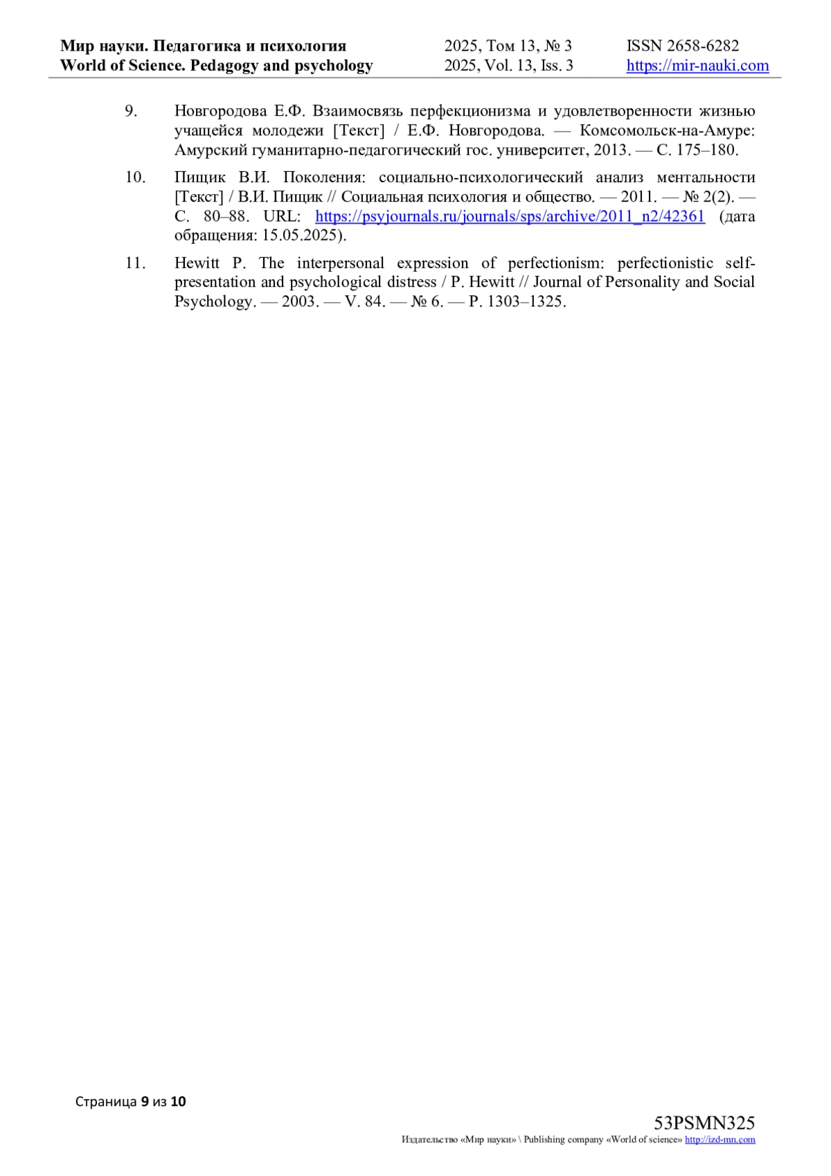 10. Пищик В.И. Поколения: социально-психологический анализ ментальности [Текст] / В.И. Пищик // Социальная психология и общество. - 2011. - № 2(2). - С. 80-88. URL: https://psyjournals.ru/journals/sps/archive/2011_n2/42361 (дата обращения: 15.05.2025). EDN: OIZZQL