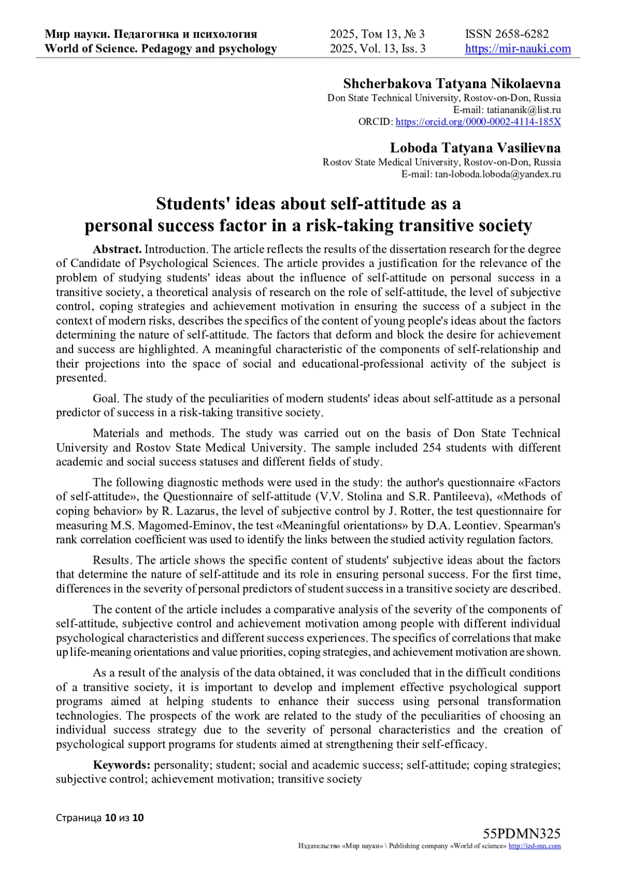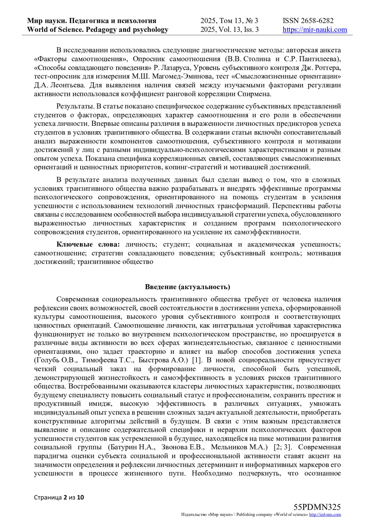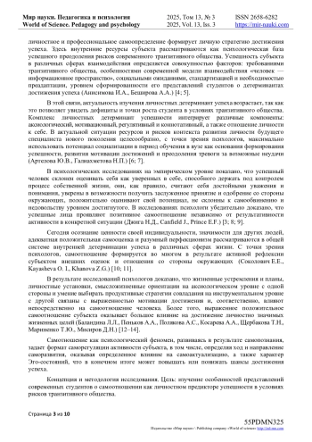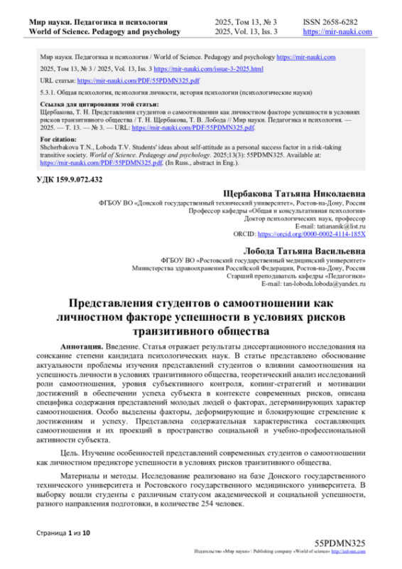 Введение. Статья отражает результаты диссертационного исследования на соискание степени кандидата психологических наук. В статье представлено обоснование актуальности проблемы изучения представлений студентов о влиянии самоотношения на успешность личности в условиях транзитивного общества, теоретический анализ исследований роли самоотношения, уровня субъективного контроля, копинг-стратегий и мотивации достижений в обеспечении успеха субъекта в контексте современных рисков, описана специфика содержания представлений молодых людей о факторах, детерминирующих характер самоотношения. Особо выделены факторы, деформирующие и блокирующие стремление к достижениям и успеху. Представлена содержательная характеристика составляющих самоотношения и их проекций в пространство социальной и учебно-профессиональной активности субъекта.