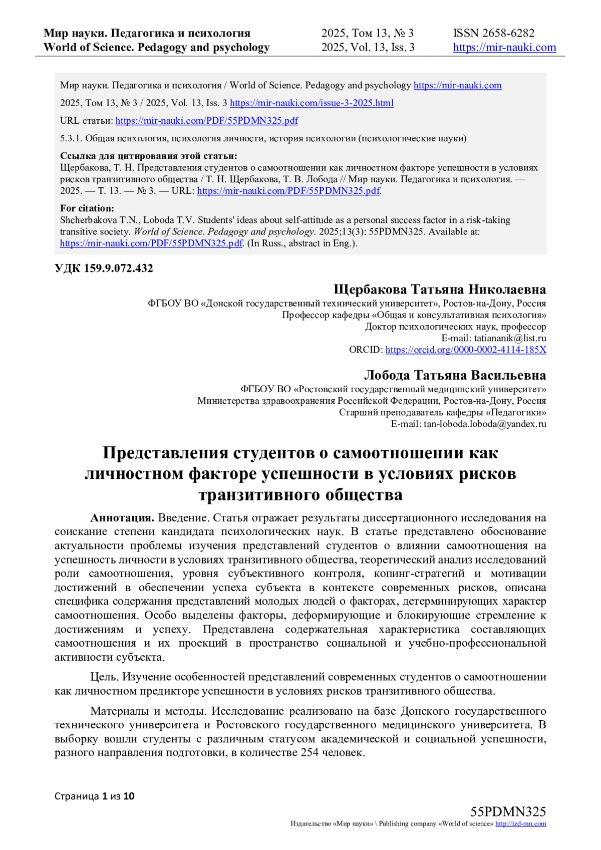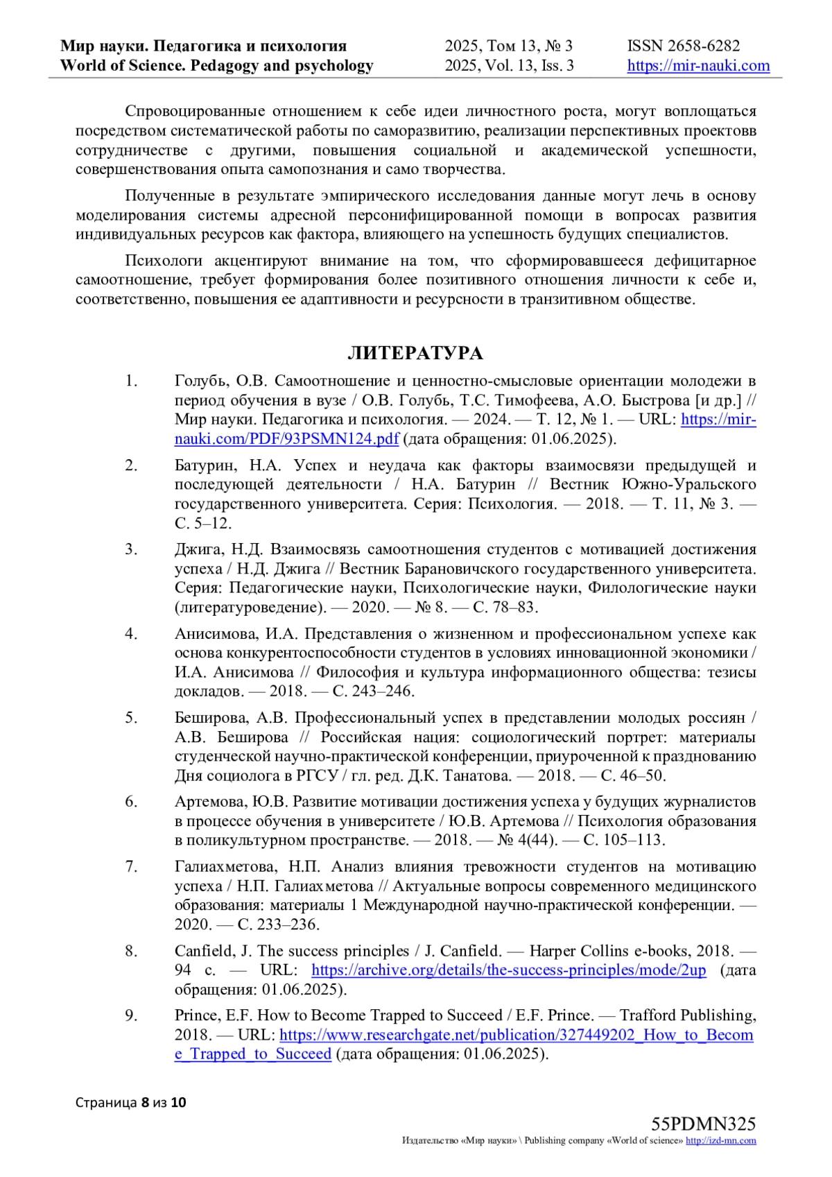 1. Голубь, О.В. Самоотношение и ценностно-смысловые ориентации молодежи в период обучения в вузе / О.В. Голубь, Т.С. Тимофеева, А.О. Быстрова [и др.] // Мир науки. Педагогика и психология. - 2024. - Т. 12, № 1. - URL: https://mir-nauki.com/PDF/93PSMN124.pdf (дата обращения: 01.06.2025). EDN: PAOBRI