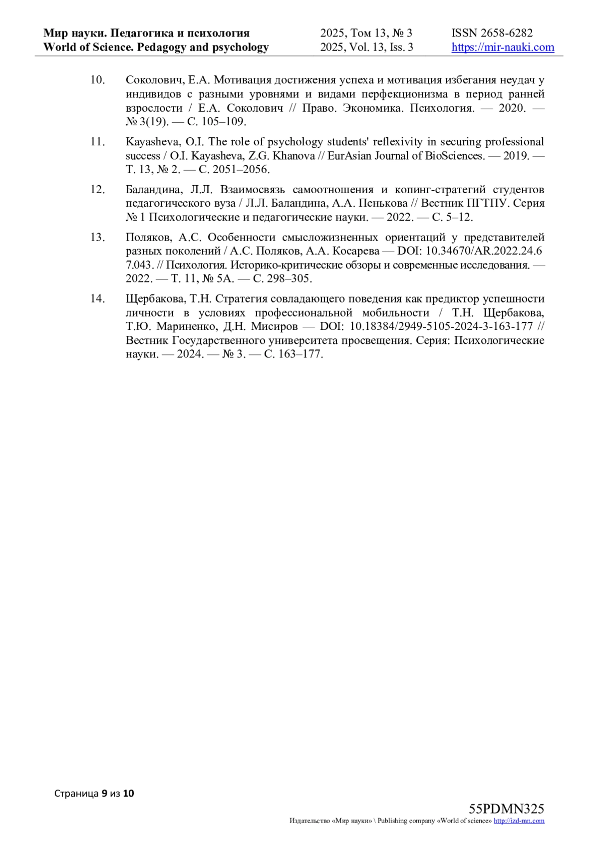 13. Поляков, А.С. Особенности смысложизненных ориентаций у представителей разных поколений / А.С. Поляков, А.А. Косарева - // Психология. Историко-критические обзоры и современные исследования. - 2022. - Т. 11, № 5А. - С. 298-305. DOI: 10.34670/AR.2022.24.67.043 EDN: KDMJHK