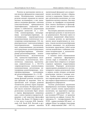 В качестве методов исследования использованы теоретические методы: социально-философский анализ, категоризация, обобщение, мысленный эксперимент, метод построения концепта и метод категориального маятника. Воспитательная функция религии прошла длительный путь от мистического до рационального. Мистический уровень проявляется посредством участия детей в разнообразных религиозных таинствах, а рациональный предполагает воспитание посредством включения в различные объединения, участия в религиозных мероприятиях, где реализуется нравственный компонент, через реализацию различных форм воспитания. Анализируя определения понятия «религиозное воспитание» выявлено пять различных позиций в его понимании.