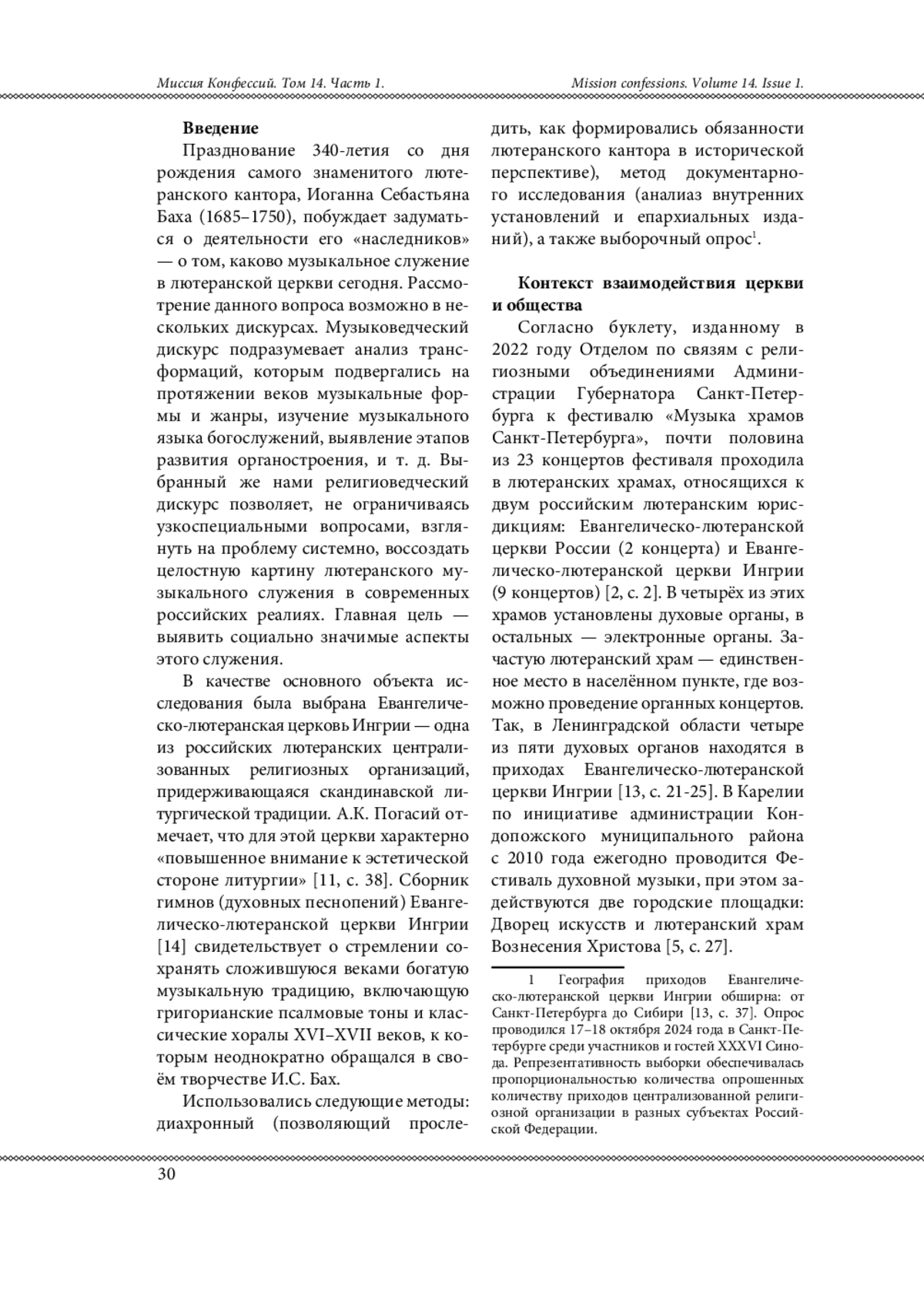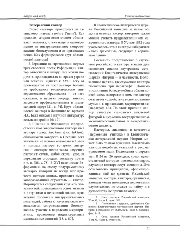 В русскоязычной научной литературе рассмотрение лютеранской музыкальной практики ограничивается, как правило, музыковедческим дискурсом: основной массив исследований посвящён деятельности И. С. Баха - знаменитого лютеранского кантора, которого отделяет от нас почти три столетия. Религиоведческие исследования, позволяющие воссоздать целостную картину музыкального служения российских лютеран в первой четверти XXI века, отсутствуют. При этом музыкальная деятельность прихода является важной точкой соприкосновения церкви и общества, создаёт основу для церковно-государственного, межконфессионального и межрелигиозного диалога, в качестве одного из ключевых участников которого выступает приходской музыкальный служитель - кантор. В процессе исследования был выявлен круг обязанностей современного лютеранского российского кантора в приходах скандинавско-финской литургической традиции. Рассмотрена богослужебная практика.