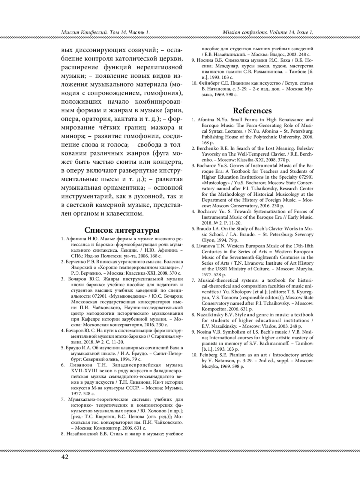 4. Бочаров Ю. С. На пути к систематизации форм инструментальной музыки эпохи барокко // Старинная музыка. 2018. № 2. С. 11-20. EDN: YLFUBV