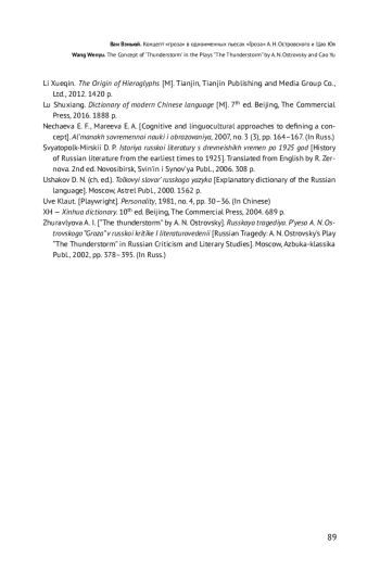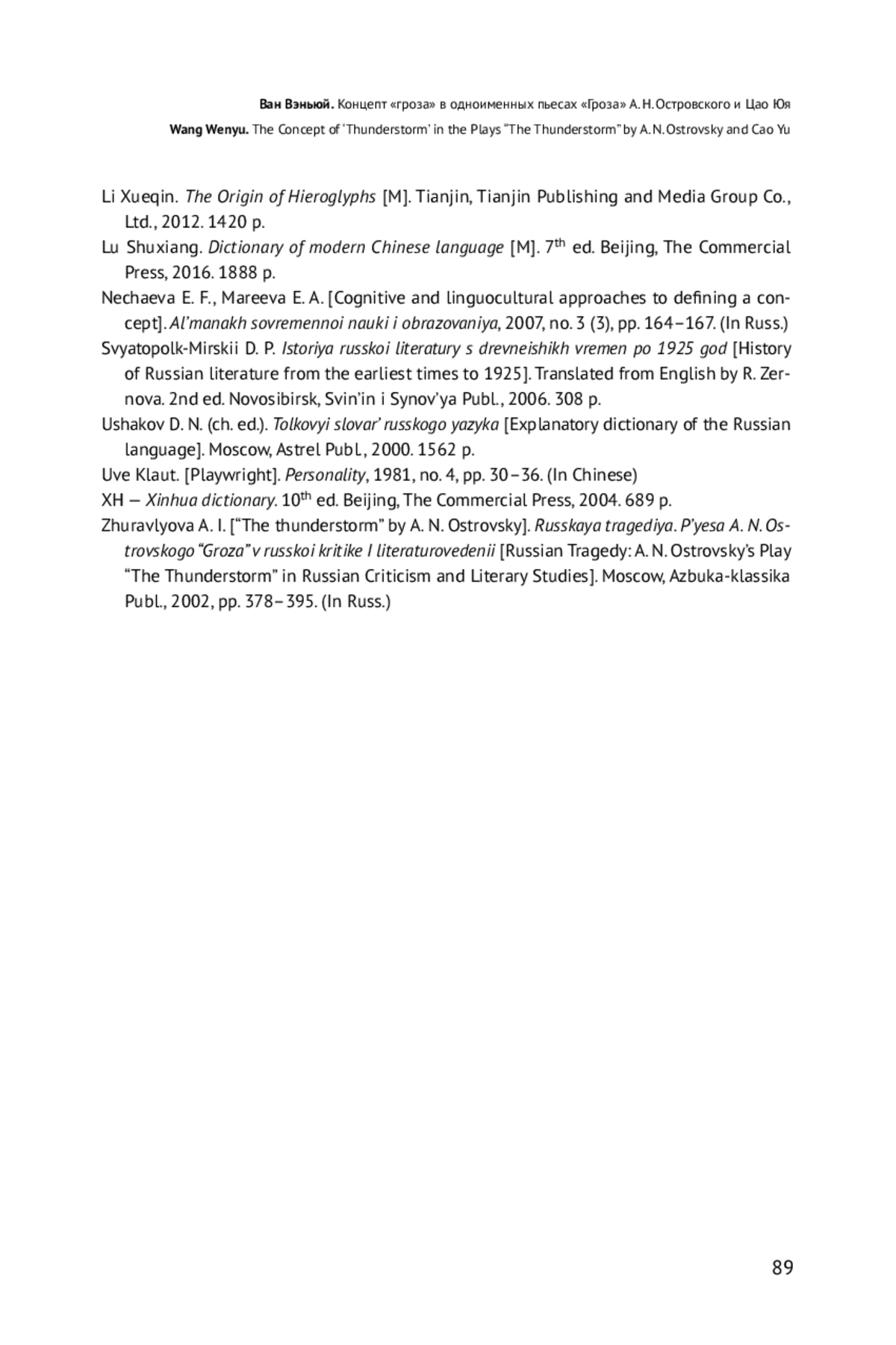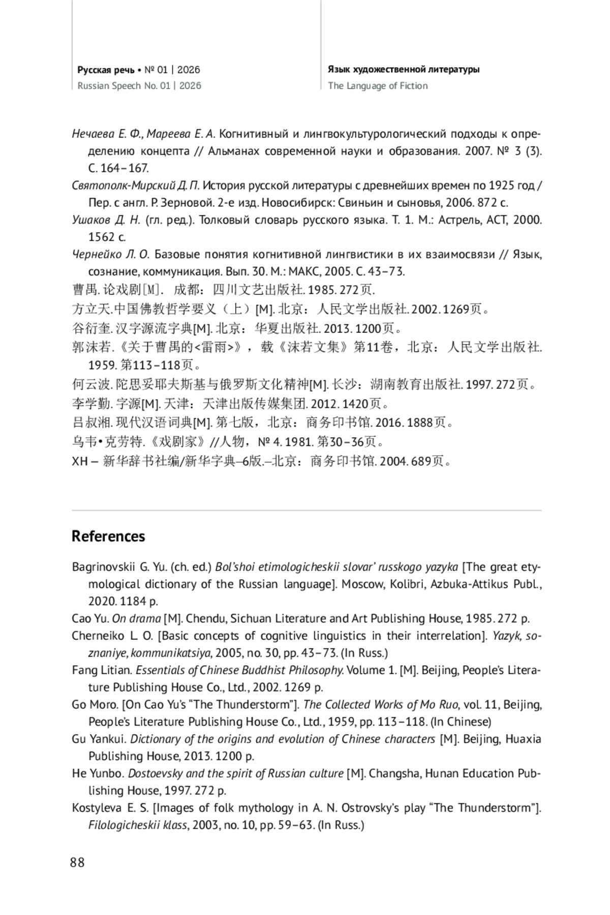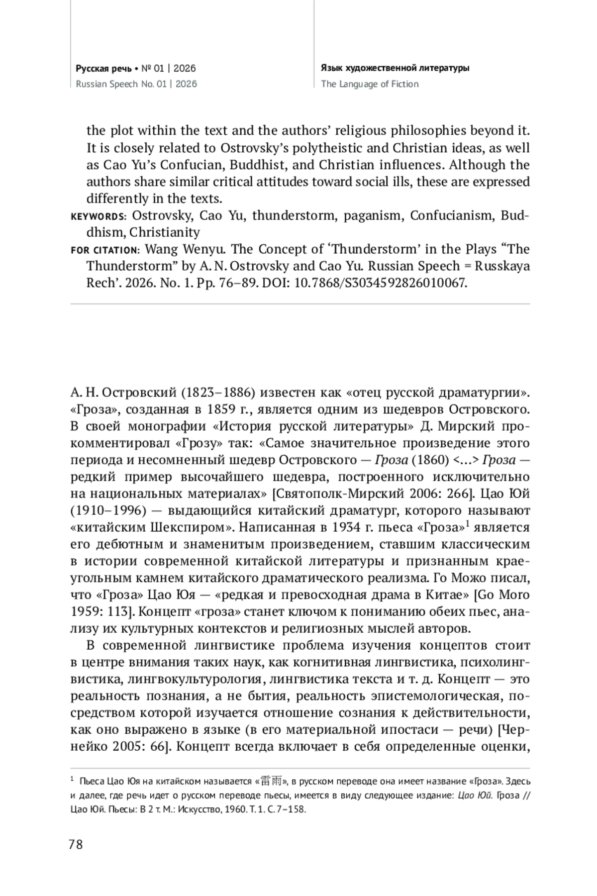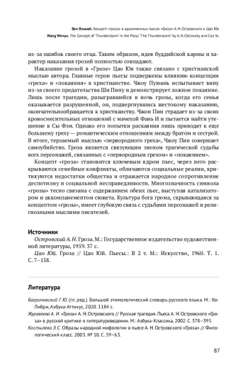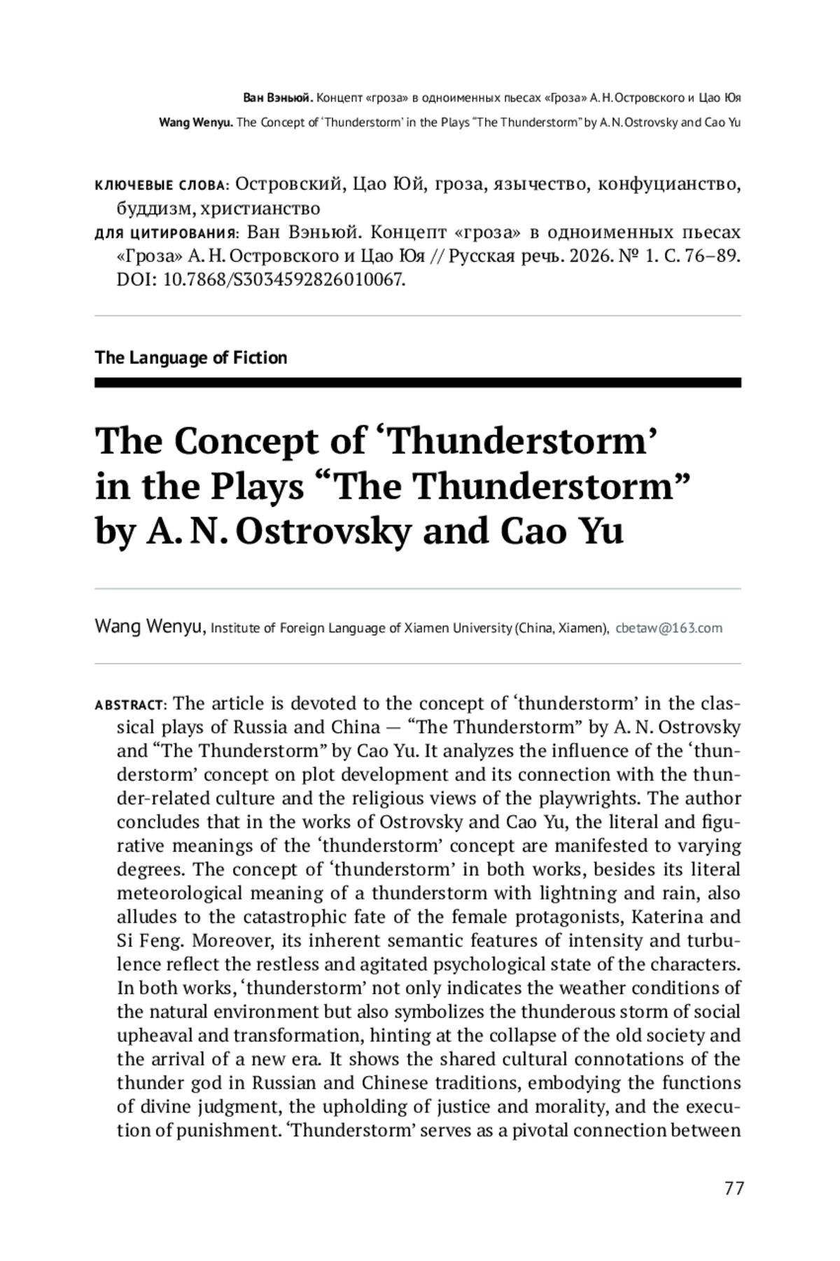 Статья посвящена исследованию концепта «гроза» в классических пьесах России и Китая — «Гроза» А. Н. Островского и «Гроза» Цао Юя. Проанализировано влияние концепта «гроза» на развитие сюжета, его связь с культурой бога грома и религиозными взглядами писателей. Автор приходит к выводу, что в пьесах Островского и Цао Юя буквальное и переносное значение слова «гроза» проявляется в разной степени. Помимо выражения буквального значения — дождливой погоды с грозой в метеорологическом смысле, слово «гроза» в обоих произведениях также намекает на трагический финал главных героинь, Катерины и Сы Фэн. Кроме того, его собственная семантика, связанная с бурей и потрясениями, отражает внутреннее беспокойство и душевное волнение персонажей. В обоих произведениях «гроза» не только указывает на погодные условия, но и символизирует громовую бурю общественных потрясений и перемен, подразумевая крах старого общества и наступление новой эпохи. Она также отражает сходные культурные представления русских и китайцев о боге грома, воплощая идеи наказания, справедливости и защиты нравственности. «Гроза» становится связующим звеном между сюжетом текста и религиознофилософскими взглядами писателей: она тесно связана с языческими и христианскими идеями Островского, а также конфуцианскими, буддийскими и христианскими мыслями Цао Юя. Хотя отношение авторов к социальным порокам сходно, в тексте это выражено по-разному.