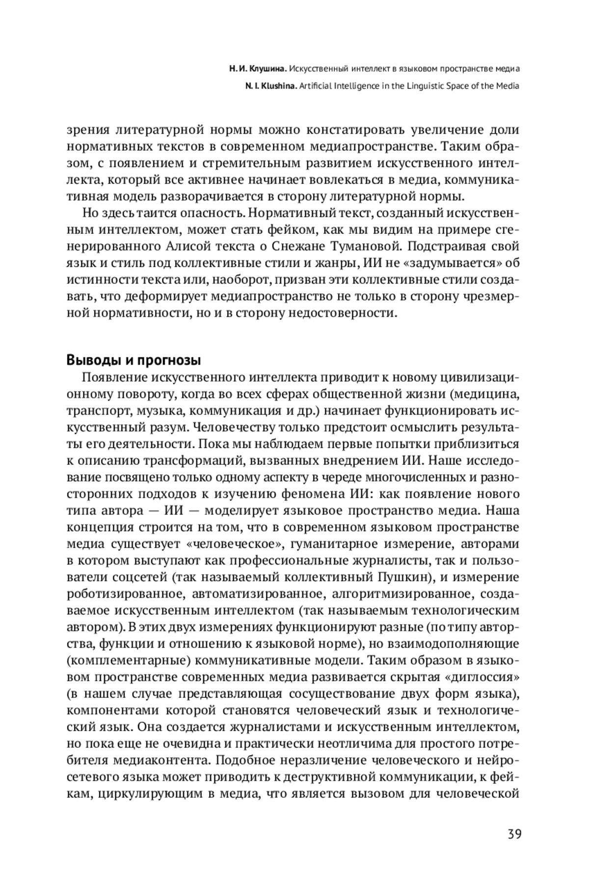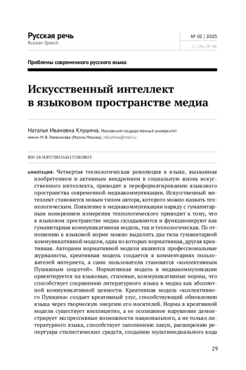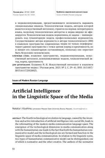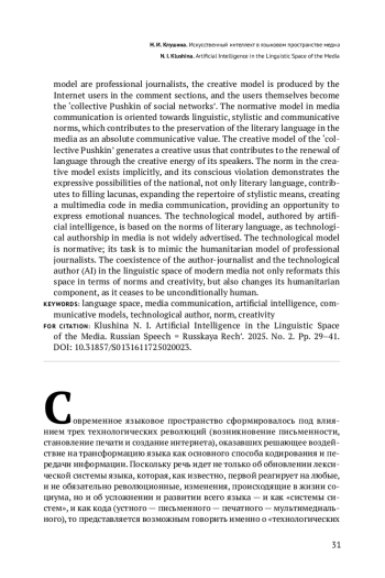Четвертая технологическая революция в языке, вызванная изобретением и активным внедрением в социальную жизнь искусственного интеллекта, приводит к переформатированию языкового пространства современной медиакоммуникации. Искусственный интеллект становится новым типом автора, которого можно назвать технологическим. Появление в медиакоммуникации наряду с гуманитарным измерением измерения технологического приводит к тому, что в языковом пространстве медиа складываются и функционируют как гуманитарная коммуникативная модель, так и технологическая. По отношению к языковой норме можно выделить два типа гуманитарной коммуникативной модели, одна из которых нормативная, другая креативная. Авторами нормативной модели являются профессиональные журналисты, креативная модель создается в комментариях пользователей интернета, а сами пользователи становятся «коллективным Пушкиным соцсетей». Нормативная модель в медиакоммуникации ориентируется на языковые, стилевые, коммуникативные нормы, что способствует сохранению литературного языка в медиа как абсолютной коммуникативной ценности. Креативная модель «коллективного Пушкина» создает креативный узус, способствующий обновлению языка через творческую энергию его носителей. Норма в креативной модели существует имплицитно, а ее осознанное нарушение демонстрирует экспрессивные возможности национального, а не только литературного языка, способствует заполнению лакун, расширению репертуара стилистических средств, созданию мультимедиального кода в медиакоммуникации, предоставляющего возможность выражать эмоциональные нюансы. Технологическая модель, автором которой является искусственный интеллект, строится на нормах литературного языка, поскольку технологическое авторство в медиа широко не афишируется. Технологическая модель нормативна, ее задача — мимикрировать под гуманитарную модель профессиональных журналистов. Сосуществование автора-журналиста и автора технологического (ИИ) в языковом пространстве современных медиа не только переформатирует данное пространство с точки зрения нормы и креативности, но и меняет его гуманитарную составляющую, поскольку оно перестает быть безусловно человеческим