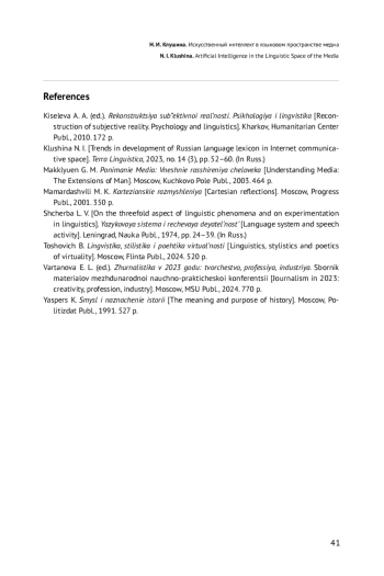 3. Клушина Н. И. Тенденции развития лексики русского языка в коммуникативном пространстве интернета // Terra Linguistica. 2023. Т. 14. № 3. С. 52-60. EDN: DTBSSL