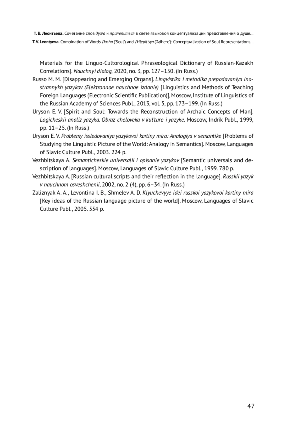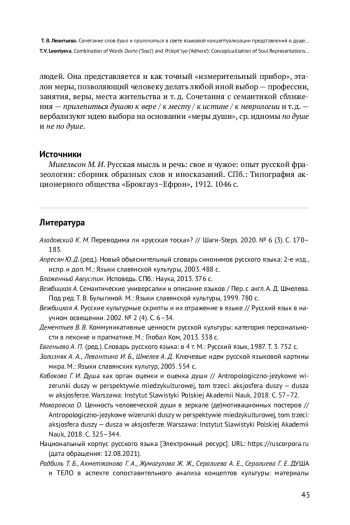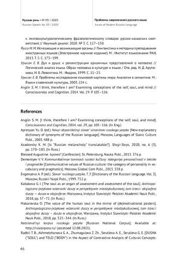 9. Кабакова Г. И. Душа как орган оценки и оценка души // Antropologiczno-jezykowe wizerunki duszy w perspektywie miedzykulturowej, tom trzeci: aksjosfera duszy - dusza w aksjosferze. Warszawa: Instytut Slawistyki Polskiej Akademii Nauk, 2018. С. 57-72.