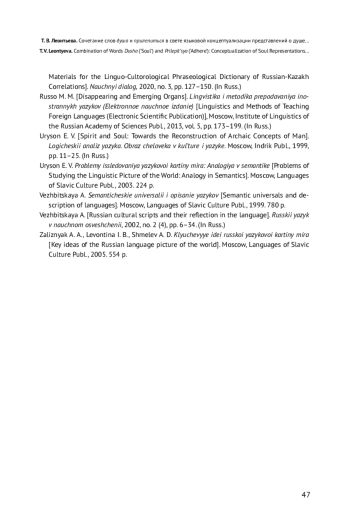12. Радбиль Т. Б., Ахметжанова Г. А., Жумагулова Ж. Ж., Сералиева А. Е., Сералиева Г. Е. ДУША и ТЕЛО в аспекте сопоставительного анализа концептов культуры: материалы к лингвокультурологическому фразеологическому словарю русско-казахских соответствий // Научный диалог. 2020. № 3. С. 127-150. EDN: EGPBXS