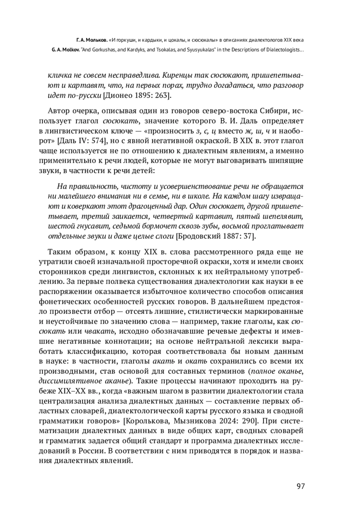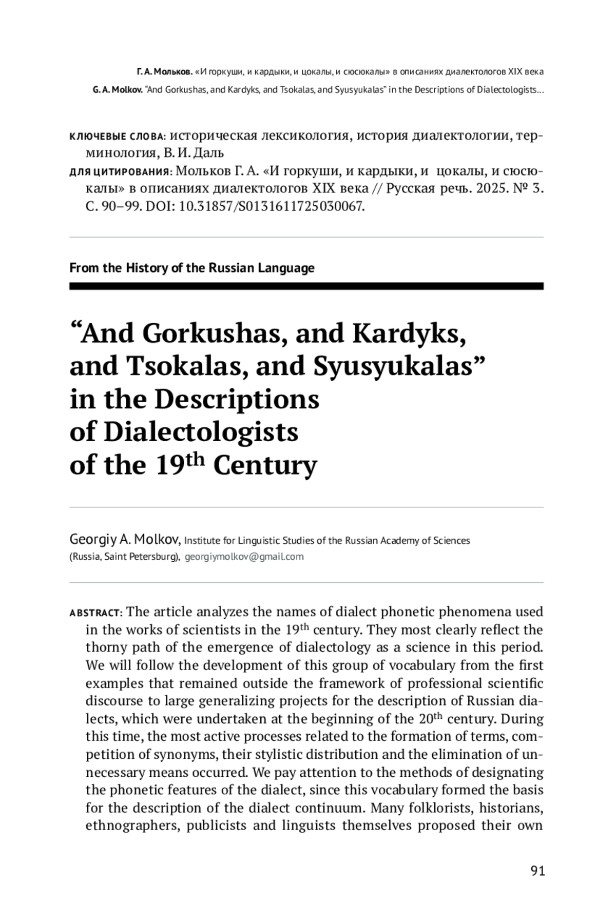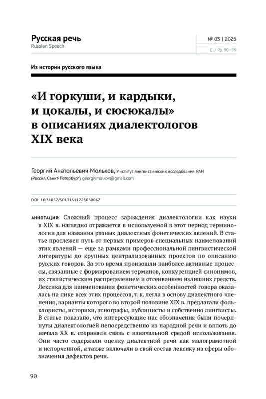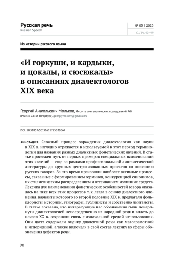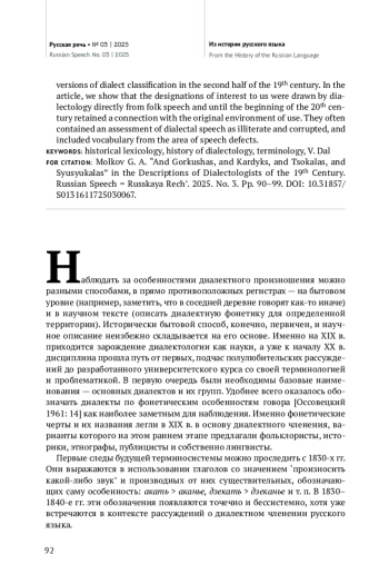 Сложный процесс зарождения диалектологии как науки в XIX в. наглядно отражается в используемой в этот период терминологии для названия разных диалектных фонетических явлений. В статье прослежен путь от первых примеров специальных наименований этих явлений — еще за рамками профессиональной лингвистической литературы до крупных централизованных проектов по описанию русских говоров. За это время произошли наиболее активные процессы, связанные с формированием терминов, конкуренцией синонимов, их стилистическим распределением и отсеиванием излишних средств. Лексика для наименования фонетических особенностей говора оказалась на пике всех этих процессов, т. к. легла в основу диалектного членения, варианты которого во второй половине XIX в. предлагали фольклористы, историки, этнографы, публицисты и собственно лингвисты. В статье показано, что интересующие нас обозначения были почерпнуты диалектологией непосредственно из народной речи и вплоть до начала XX в. сохраняли связь с изначальной средой использования. Они часто содержали оценку диалектной речи как малограмотной и испорченной, а также включали в свой состав лексику из сферы обозначения дефектов речи