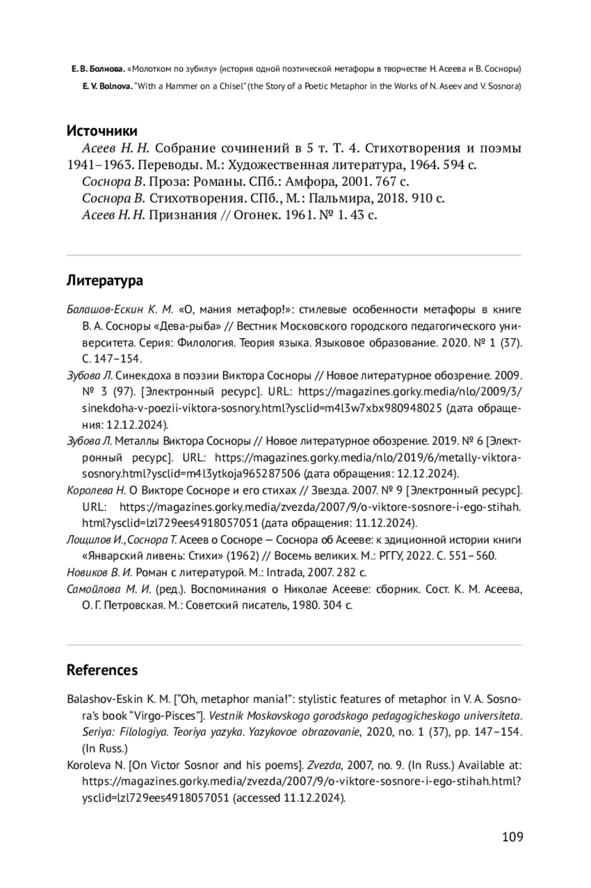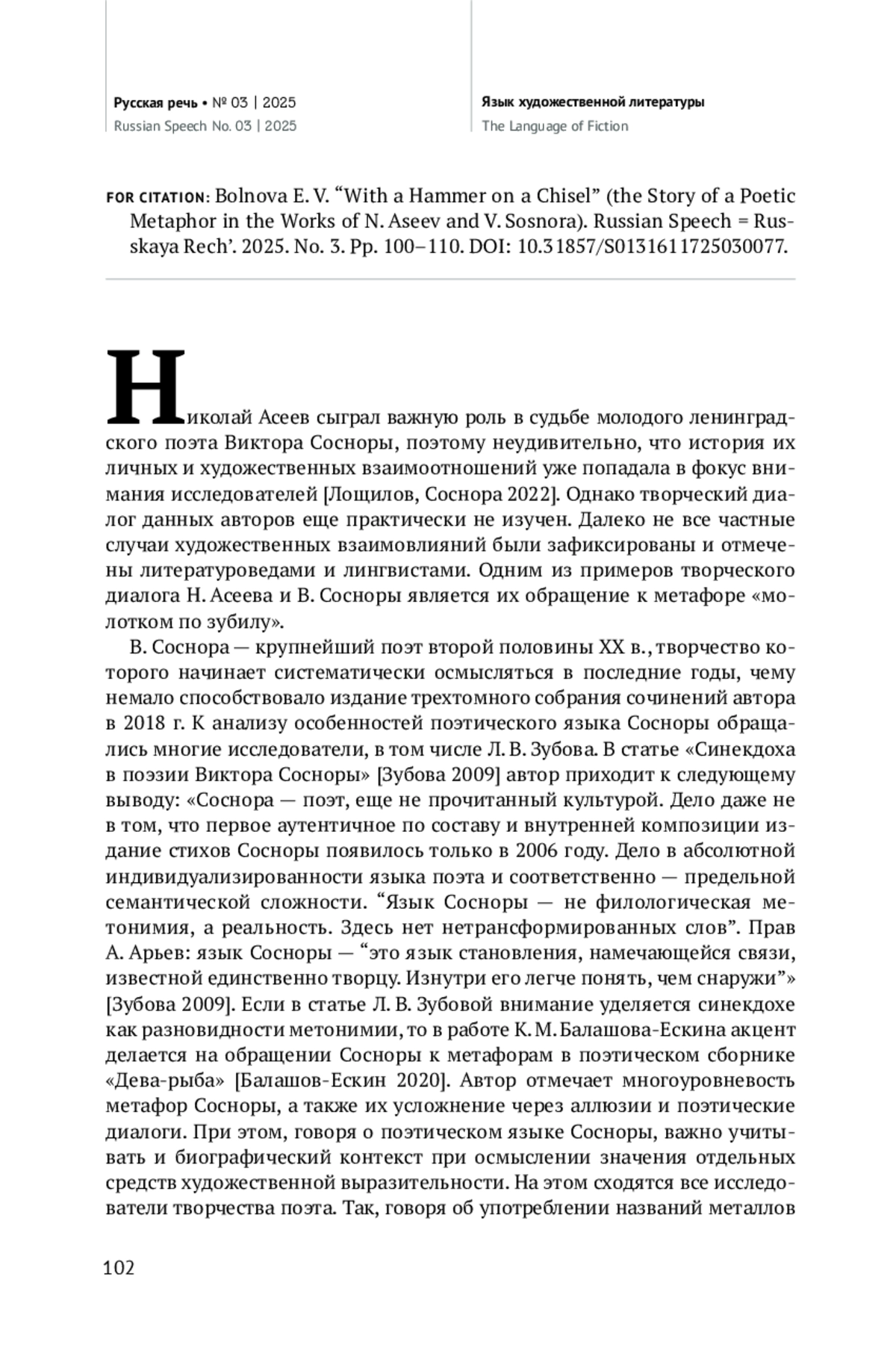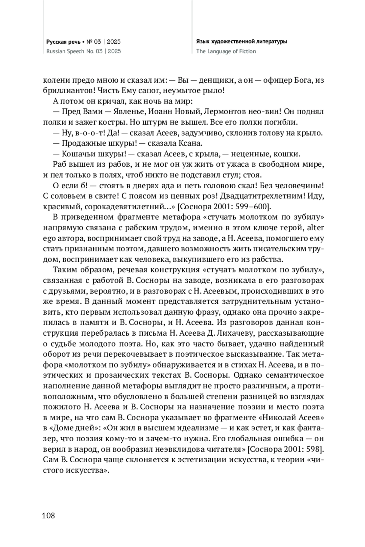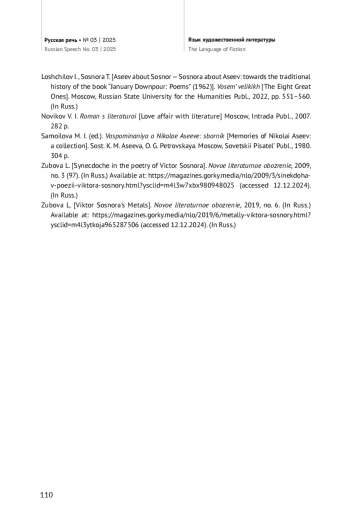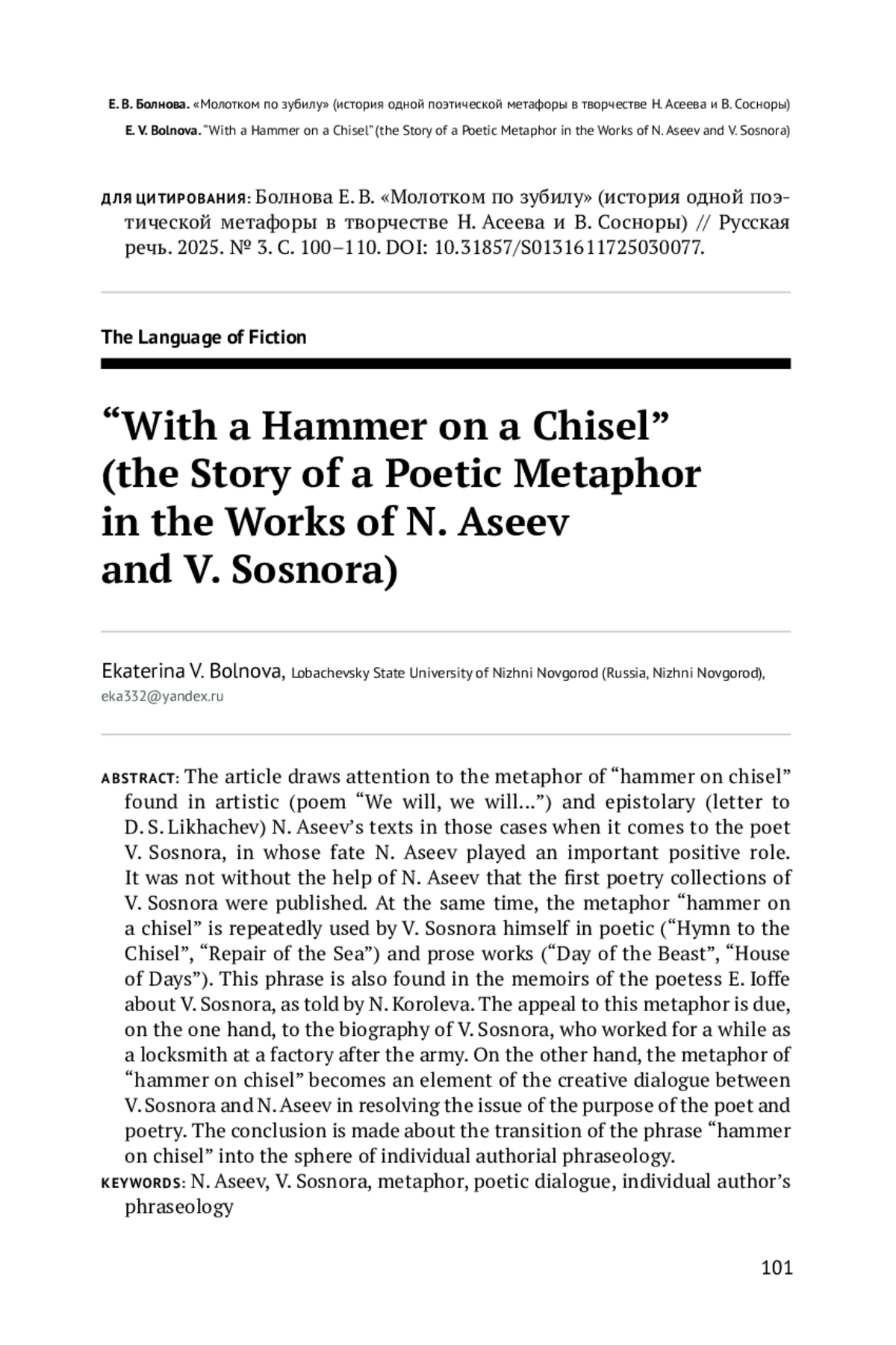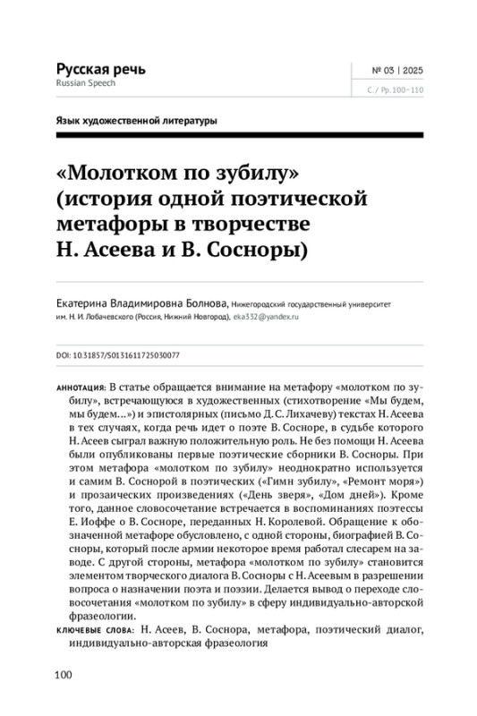В статье обращается внимание на метафору «молотком по зубилу», встречающуюся в художественных (стихотворение «Мы будем, мы будем…») и эпистолярных (письмо Д. С. Лихачеву) текстах Н. Асеева в тех случаях, когда речь идет о поэте В. Сосноре, в судьбе которого Н. Асеев сыграл важную положительную роль. Не без помощи Н. Асеева были опубликованы первые поэтические сборники В. Сосноры. При этом метафора «молотком по зубилу» неоднократно используется и самим В. Соснорой в поэтических («Гимн зубилу», «Ремонт моря») и прозаических произведениях («День зверя», «Дом дней»). Кроме того, данное словосочетание встречается в воспоминаниях поэтессы Е. Иоффе о В. Сосноре, переданных Н. Королевой. Обращение к обозначенной метафоре обусловлено, с одной стороны, биографией В. Сосноры, который после армии некоторое время работал слесарем на заводе. С другой стороны, метафора «молотком по зубилу» становится элементом творческого диалога В. Сосноры с Н. Асеевым в разрешении вопроса о назначении поэта и поэзии. Делается вывод о переходе словосочетания «молотком по зубилу» в сферу индивидуально-авторской фразеологии