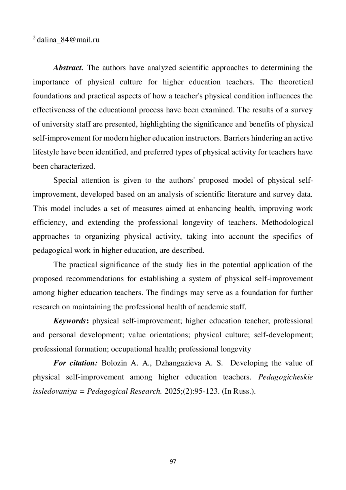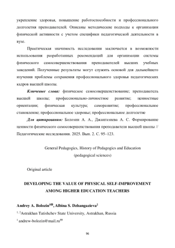 Авторами рассмотрены научные подходы к определению значимости физической культуры для преподавателей высших учебных заведений. Проанализированы теоретические основы и практические аспекты влияния физического состояния педагога на эффективность образовательного процесса. Описаны результаты опроса сотрудников университета, которые подчеркнули важность и пользу физического саморазвития для современного преподавателя вуза. Определены барьеры, затрудняющие ведение активного образа жизни, и охарактеризованы предпочтительные для преподавателей виды физической активности. Особое внимание уделено разработанной авторами на основе анализа научных работ и опроса модели физического самосовершенствования, включающей комплекс различных мероприятий, которые направлены на укрепление здоровья, повышение работоспособности и профессионального долголетия преподавателей. Описаны методические подходы к организации физической активности с учетом специфики педагогической деятельности в вузе. Практическая значимость исследования заключается в возможности использования разработанных рекомендаций для организации системы физического самосовершенствования преподавателей высших учебных заведений. Полученные результаты могут служить основой для дальнейшего изучения проблемы сохранения профессионального здоровья педагогических кадров высшей школы.