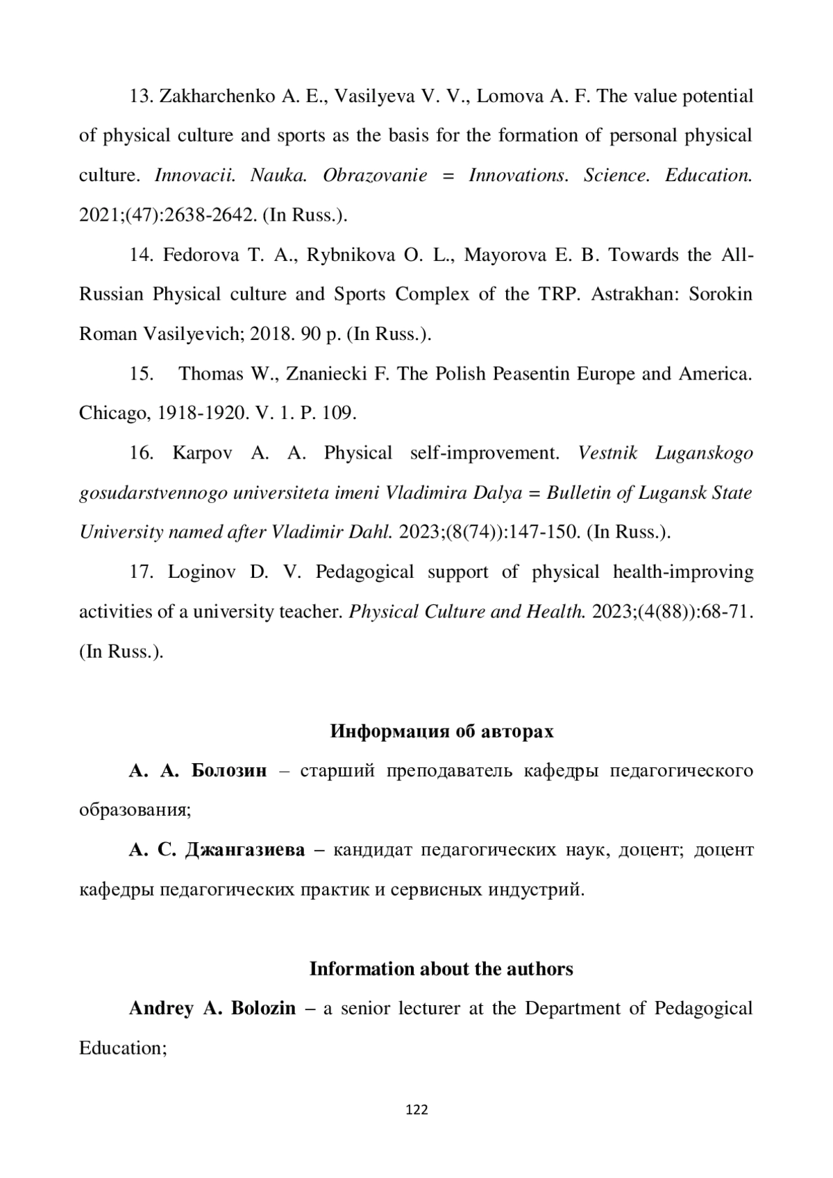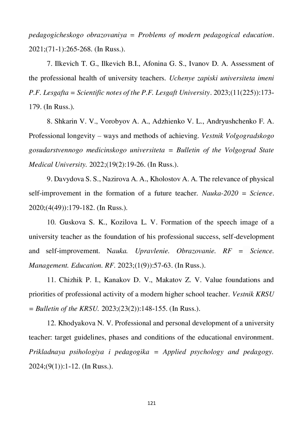 7. Илькевич Т. Г., Илькевич Б. И., Афонина Г. С., Иванов Д. А. Оценка профессионального здоровья педагогов вуза // Ученые записки университета имени П. Ф. Лесгафта. 2023. № 11 (225). С. 173-179. EDN: WPDBFE