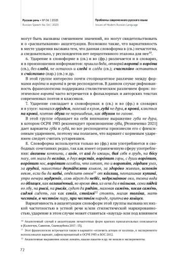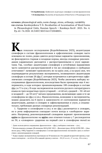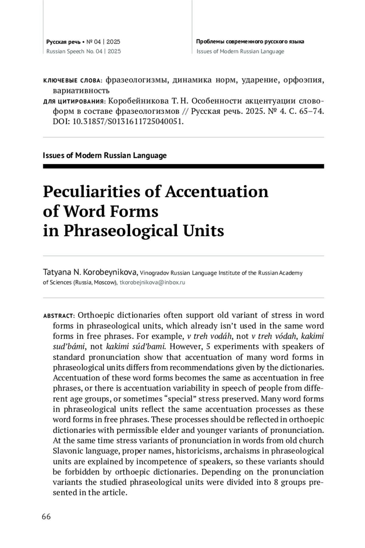 Часто орфоэпические словари фиксируют в словоформах в составе фразеологизмов старый вариант ударения, который уже не используется в этих же словоформах в свободных сочетаниях. Например, в трех вода́х, а не в трех во́дах, какими судьба́ми, а не какими су́дьбами. Однако в ходе пяти экспериментов с москвичами — носителями литературного произношения — было выявлено, что акцентуация многих словоформ в составе фразеологизмов отличается от той, которая рекомендована орфоэпическими словарями. Ударение в этих словоформах либо становится таким же, как в свободных сочетаниях, либо варьируется у респондентов разных возрастных групп, либо (в редких случаях) «особое» ударение сохраняется. При этом многие словоформы в составе фразеологизмов отражают акцентуационные процессы, протекающие в тех же словоформах в свободных сочетаниях. Эти процессы следует фиксировать в словарях, вводя допустимые старшие и младшие варианты произношения. В то же время варианты, отмеченные в ударении церковнославянизмов, образований от имен собственных, историзмов и архаизмов в составе фразеологизмов, объясняются незнанием этих слов, а следовательно, должны даваться в орфоэпических словарях с запретительными пометами. В зависимости от соотношения вариантов произношения исследованные фразеологизмы были разделены на 8 групп, представленных в статье.