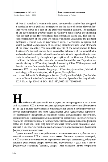 В статье рассматриваются особенности авторского осмысления идеологемы почва в публицистике И. С. Аксакова. Большой удельный вес публицистики в русском литературном языке XIX века, зависимость семантики слова-идеологемы в текстах данного стиля от позиции автора обусловливают необходимость обращения к текстам представителей различных направлений при исследовании истории слова. Произведения славянофилов, представителей одного из основных направлений в общественно-политической жизни пореформенной России, остаются в лингвистическом отношении малоизученными. Исследование проводится на материале текстов И. С. Аксакова, поскольку данный автор сформировал цельную общественно-политическую позицию, ставшую частью контекста публичной полемики в пореформенной России, на основе теоретических взглядов старших славянофилов. Анализ примеров употребления слова-идеологемы почва в произведениях И. С. Аксакова показывает, что она приобретает значение ‘основание, самая глубокая точка, с опорой на которую осуществляется закономерное развитие’. В контекстуальном окружении слова, включающем иную лексику, репрезентирующую политическую метафору «земля-почва», актуализируются духовно-религиозные и общественно-политические компоненты семантики, происходит частичная деметафоризация. Семантическая специфика слова в публицистике И. С. Аксакова является следствием как семантических импульсов со стороны немецкого слова Boden, так и смыслового взаимодействия лексики в контекстах, на объединение которой влияет рецепция славянофилами немецкой философской традиции. Проведенный анализ, таким образом, позволяет дополнить семантическую историю слова почва в XIX столетии, предложенную В. В. Виноградовым, указав на недостаточность влияния на нее французского слова terrain