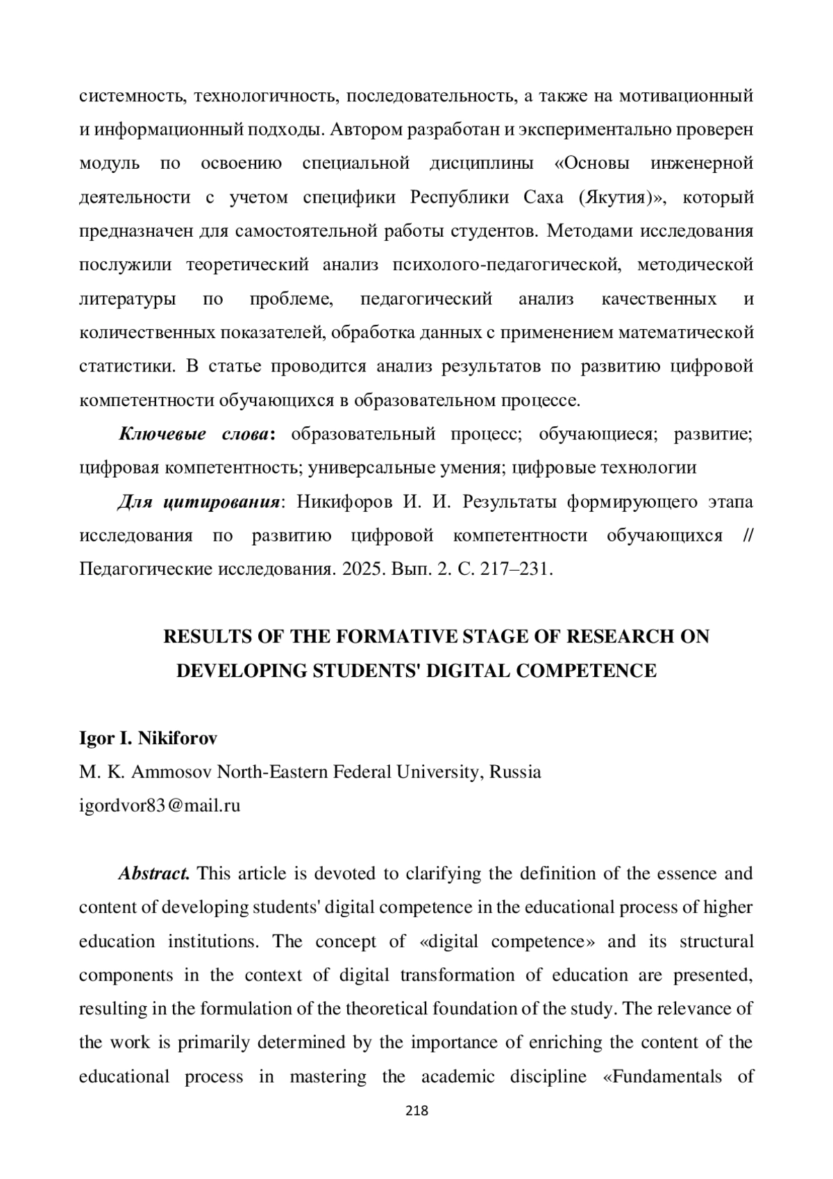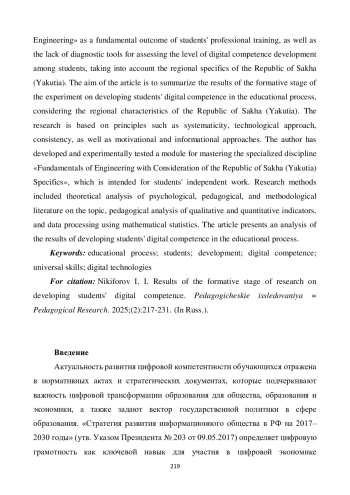 Данная статья посвящена уточнению определения сущности и содержания развития цифровой компетентности обучающихся в образовательном процессе вуза. Представлены понятие «цифровая компетентность» и ее структурные компоненты в условиях цифровой трансформации образования, в результате чего сформулирован теоретический базис исследования. Актуальность исследования обусловлена, в первую очередь, значимостью обогащения содержания образовательного процесса при освоении учебной дисциплины «Основы инженерной деятельности» как базовый результат профессиональной подготовки обучающихся, а также отсутствием диагностических инструментариев для определения уровня сформированности цифровой компетентности обучающихся с учетом региональной специфики Республики Саха (Якутия). Цель статьи - обобщение результатов формирующего этапа эксперимента по развитию цифровой компетентности обучающихся в образовательном процессе с учетом специфики региона Республика Саха (Якутия). Исследование опирается на такие принципы, как системность, технологичность, последовательность, а также на мотивационный и информационный подходы. Автором разработан и экспериментально проверен модуль по освоению специальной дисциплины «Основы инженерной деятельности с учетом специфики Республики Саха (Якутия)», который предназначен для самостоятельной работы студентов. Методами исследования послужили теоретический анализ психолого-педагогической, методической литературы по проблеме, педагогический анализ качественных и количественных показателей, обработка данных с применением математической статистики. В статье проводится анализ результатов по развитию цифровой компетентности обучающихся в образовательном процессе.