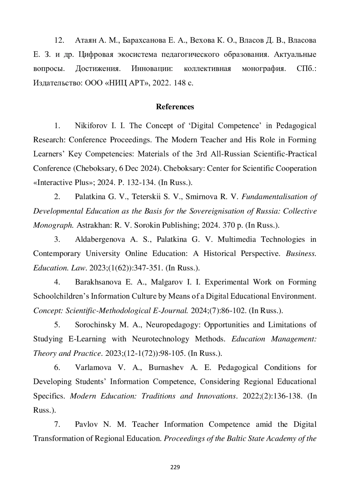 12. Атаян А. М., Барахсанова Е. А., Вехова К. О., Власов Д. В., Власова Е. З. и др. Цифровая экосистема педагогического образования. Актуальные вопросы. Достижения. Инновации: коллективная монография. СПб.: Издательство: ООО “НИЦ АРТ”, 2022. 148 с.