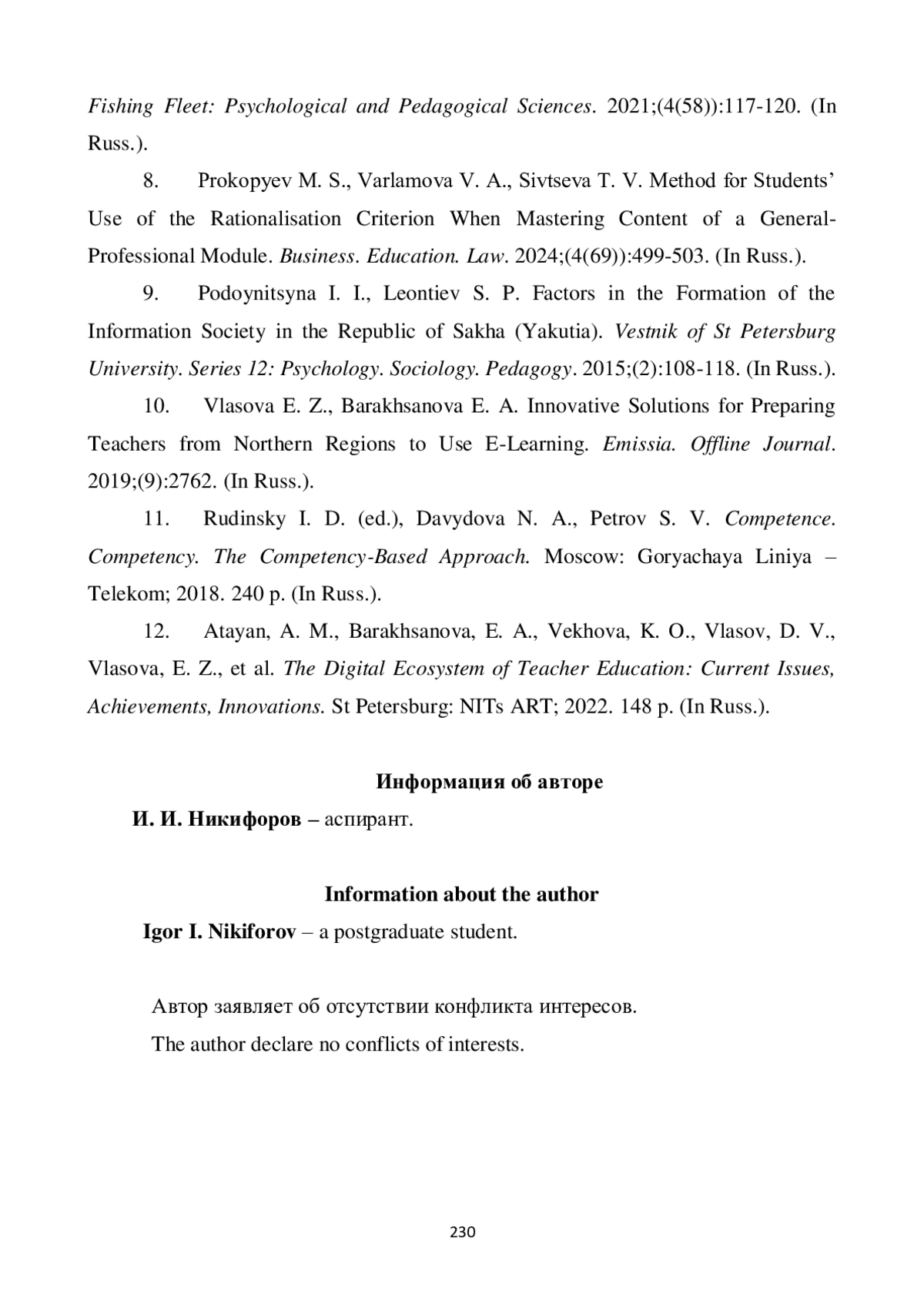 7. Павлов Н. М. Информационная компетентность учителя в условиях цифровой трансформации регионального образования // Известия Балтийской государственной академии рыбопромыслового флота: психолого-педагогические науки. 2021. № 4 (58). С. 117-120. EDN: OWVJUV