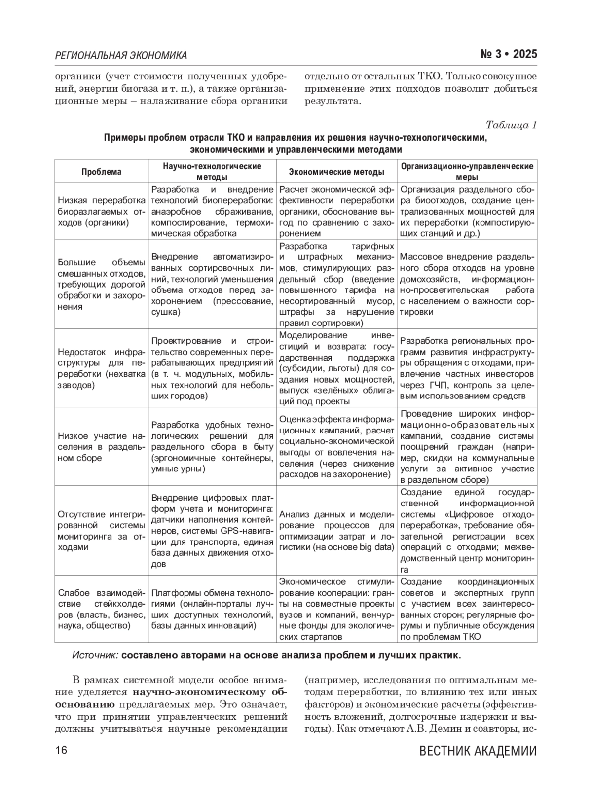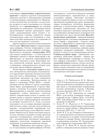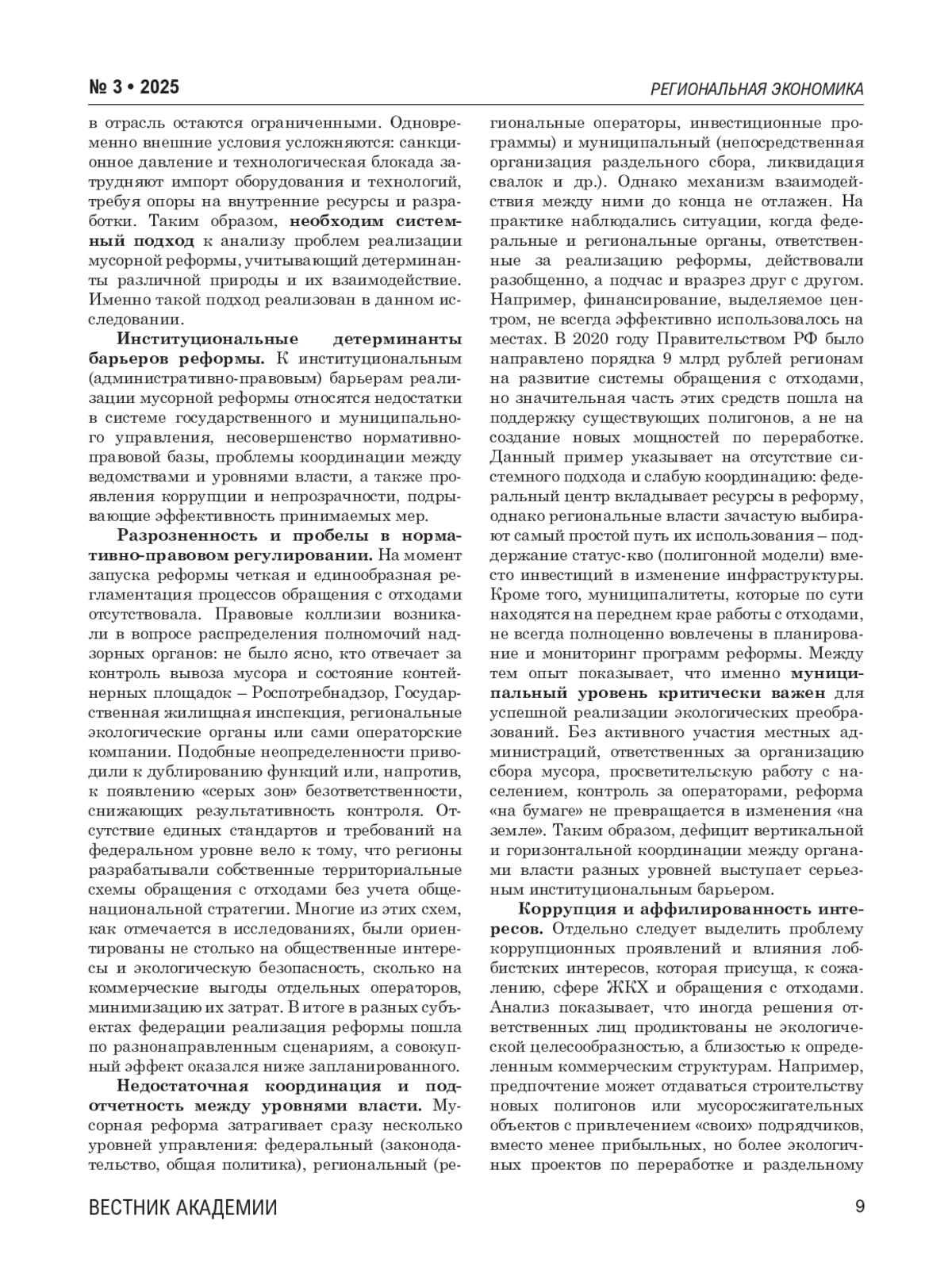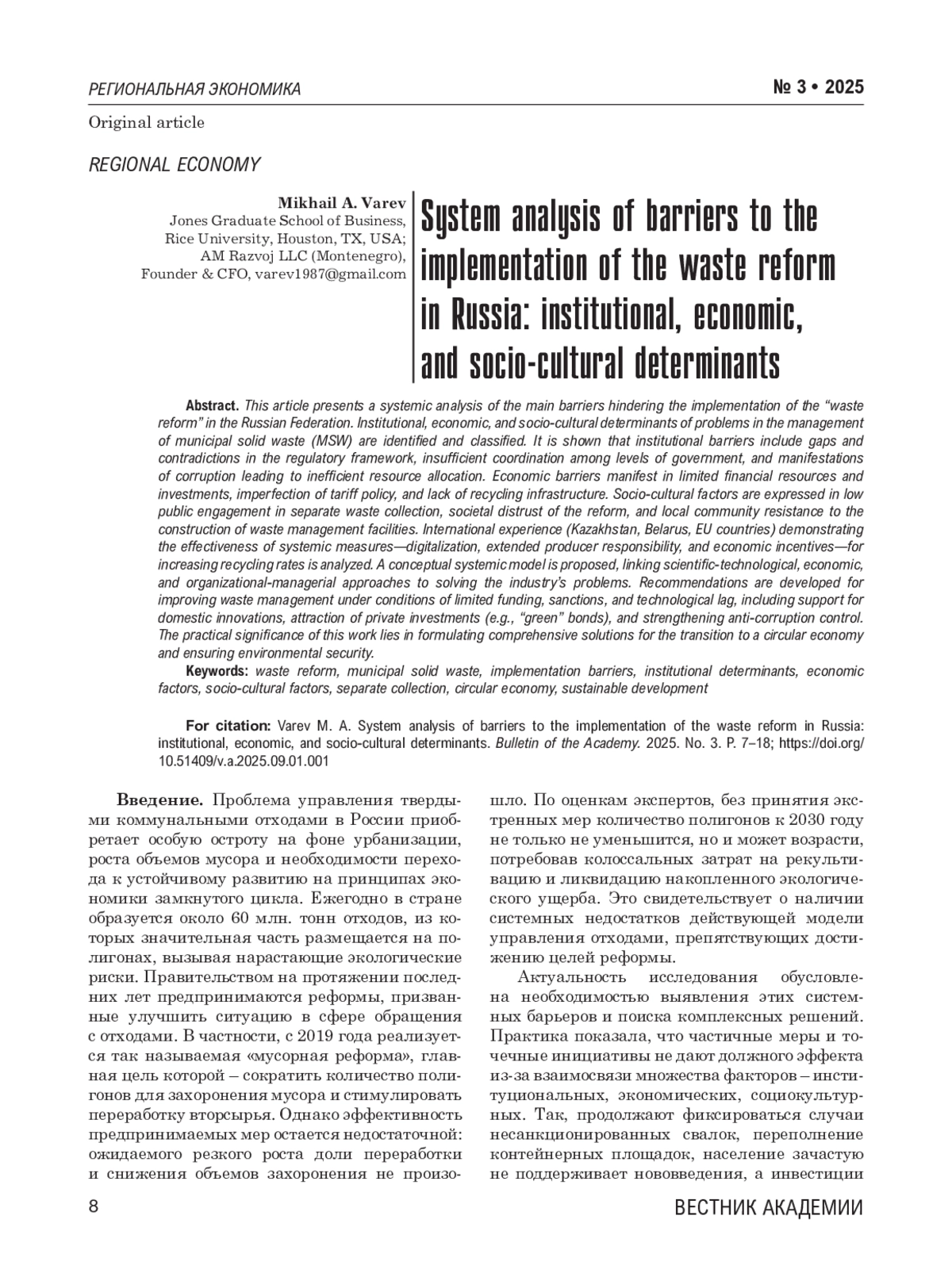 В статье представлен системный анализ основных барьеров, препятствующих реализации «мусорной реформы» в Российской Федерации. Выявлены и классифицированы институциональные, экономические и социокультурные детерминанты проблем в сфере обращения с твердыми коммунальными отходами (ТКО). Установлено, что институциональные барьеры включают пробелы и противоречия в нормативно-правовой базе, недостаточную координацию между уровнями власти и проявления коррупции, приводящие к неэффективному распределению ресурсов. Экономические барьеры выражаются в ограниченности финансовых средств и инвестиций, несовершенстве тарифной политики и недостатке инфраструктуры переработки. Социокультурные факторы проявляются в низкой вовлеченности населения в раздельный сбор мусора, недоверии общества к реформе и сопротивлении местных сообществ строительству объектов обращения с отходами. Проанализирован международный опыт (Казахстан, Беларусь, страны ЕС), продемонстрировавший эффективность системных мер – цифровизация, расширенная ответственность производителей, экономические стимулы – для повышения доли. Предложена концептуальная системная модель, увязывающая научно-технологические, экономические и организационно-управленческие подходы к решению проблем отрасли. Разработаны рекомендации по совершенствованию управления отходами в условиях ограниченного финансирования, санкций и технологического отставания, включающие поддержку отечественных инноваций, привлечение частных инвестиций (например, «зелёных» облигаций) и усиление антикоррупционного контроля. Практическая значимость работы состоит в формулировании комплексных решений для перехода к экономике замкнутого цикла и обеспечении экологической безопасности.