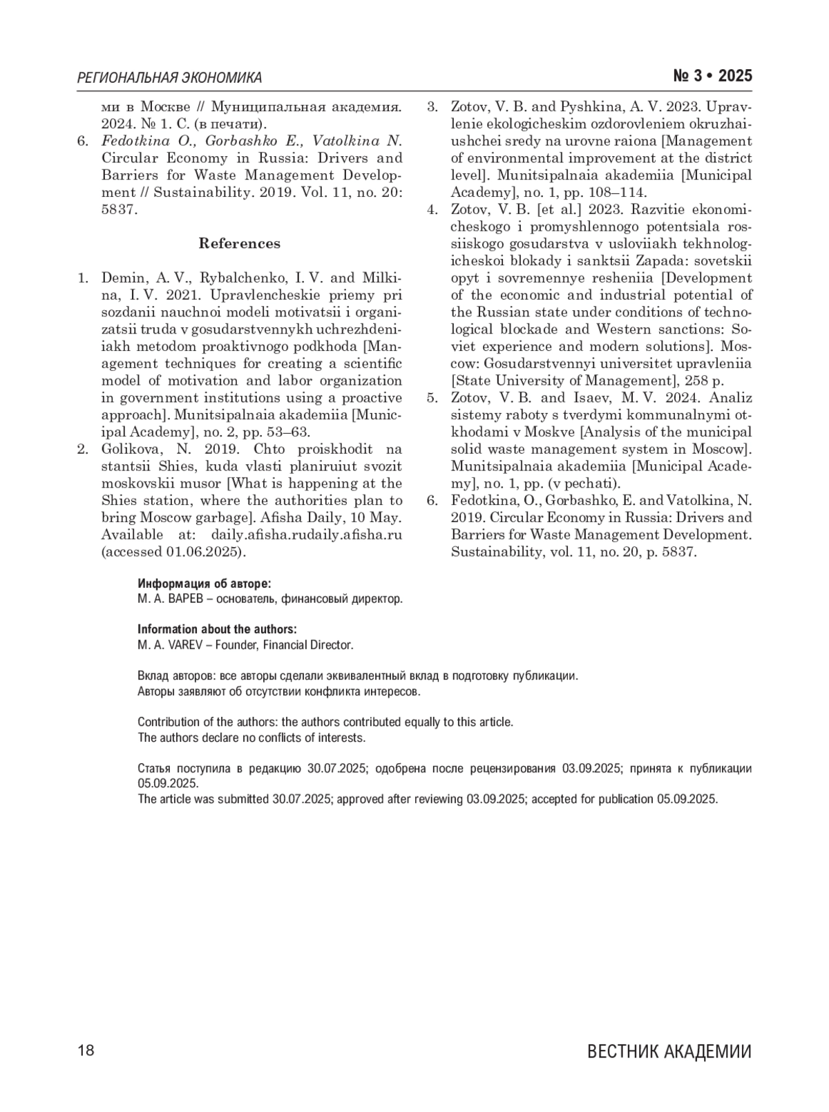 6. Fedotkina O., Gorbashko E., Vatolkina N. Circular Economy in Russia: Drivers and Barriers for Waste Management Development // Sustainability. 2019. Vol. 11, no. 20: 5837.