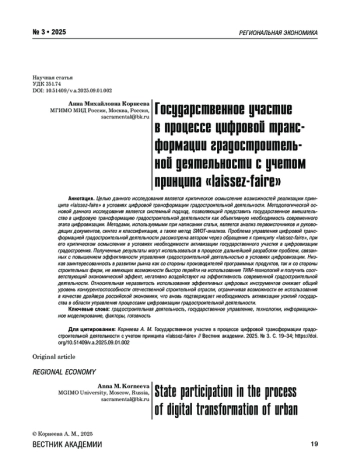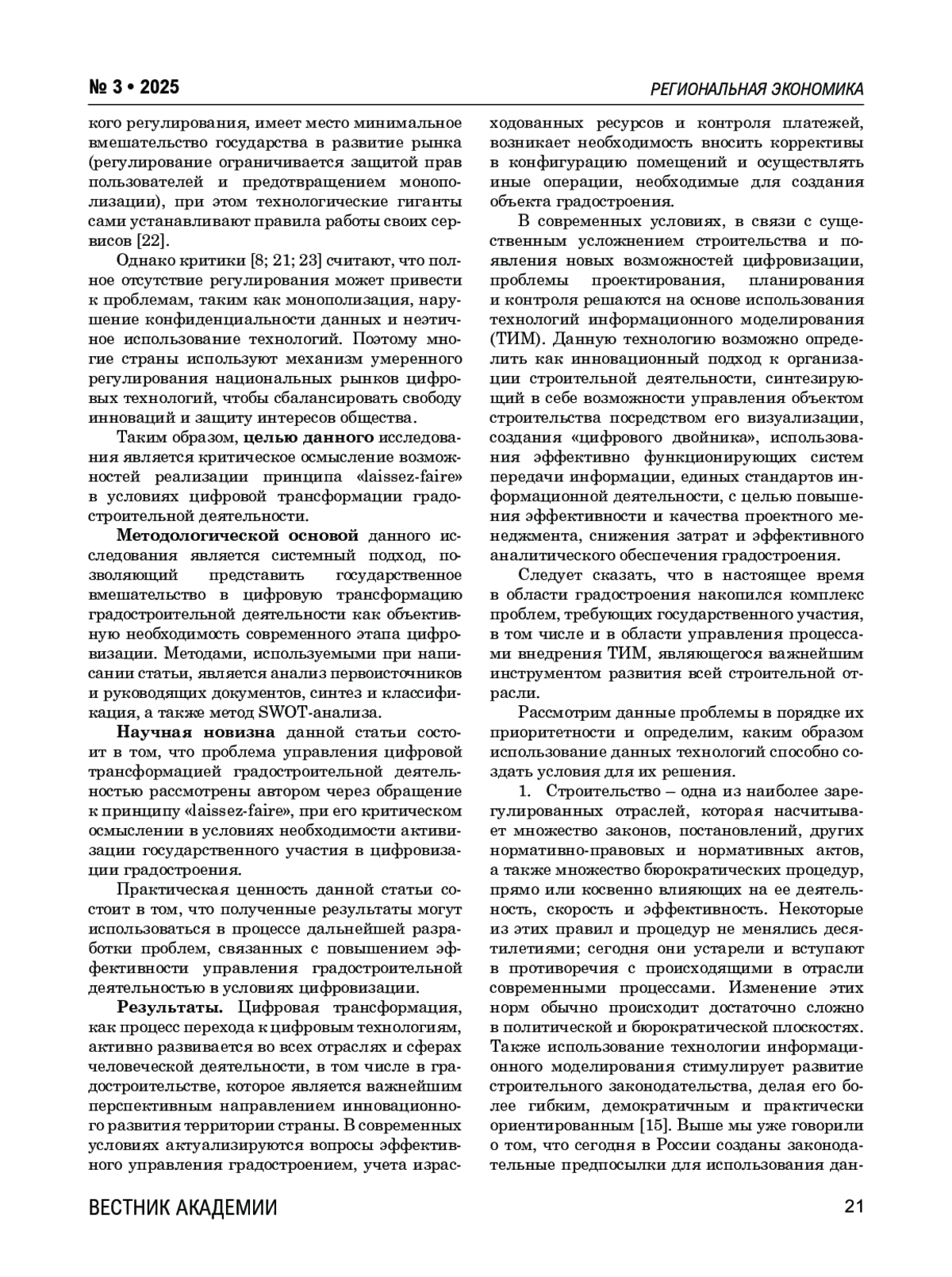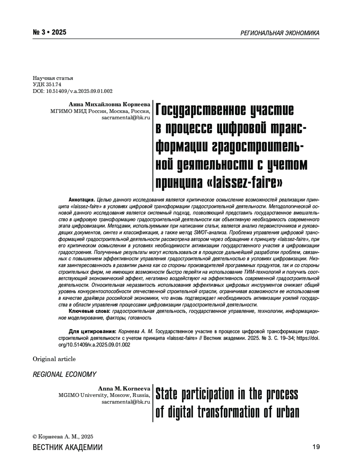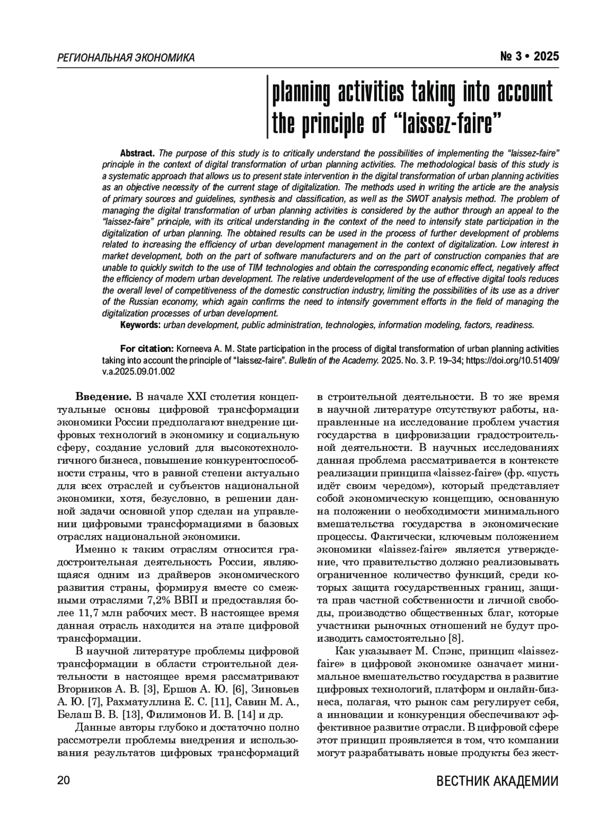 Целью данного исследования является критическое осмысление возможностей реализации принципа «laissez-faire» в условиях цифровой трансформации градостроительной деятельности. Методологической основой данного исследования является системный подход, позволяющий представить государственное вмешательство в цифровую трансформацию градостроительной деятельности как объективную необходимость современного этапа цифровизации. Методами, используемыми при написании статьи, является анализ первоисточников и руководящих документов, синтез и классификация, а также метод SWOT-анализа. Проблема управления цифровой трансформацией градостроительной деятельности рассмотрена автором через обращение к принципу «laissez-faire», при его критическом осмыслении в условиях необходимости активизации государственного участия в цифровизации градостроения. Полученные результаты могут использоваться в процессе дальнейшей разработки проблем, связанных с повышением эффективности управления градостроительной деятельностью в условиях цифровизации. Низкая заинтересованность в развитии рынка как со стороны производителей программных продуктов, так и со стороны строительных фирм, не имеющих возможности быстро перейти на использование ТИМ-технологий и получить соответствующий экономический эффект, негативно воздействуют на эффективность современной градостроительной деятельности. Относительная неразвитость использования эффективных цифровых инструментов снижает общий уровень конкурентоспособности отечественной строительной отрасли, ограничивая возможности ее использования в качестве драйвера российской экономики, что вновь подтверждает необходимость активизации усилий государства в области управления процессами цифровизации градостроительной деятельности.