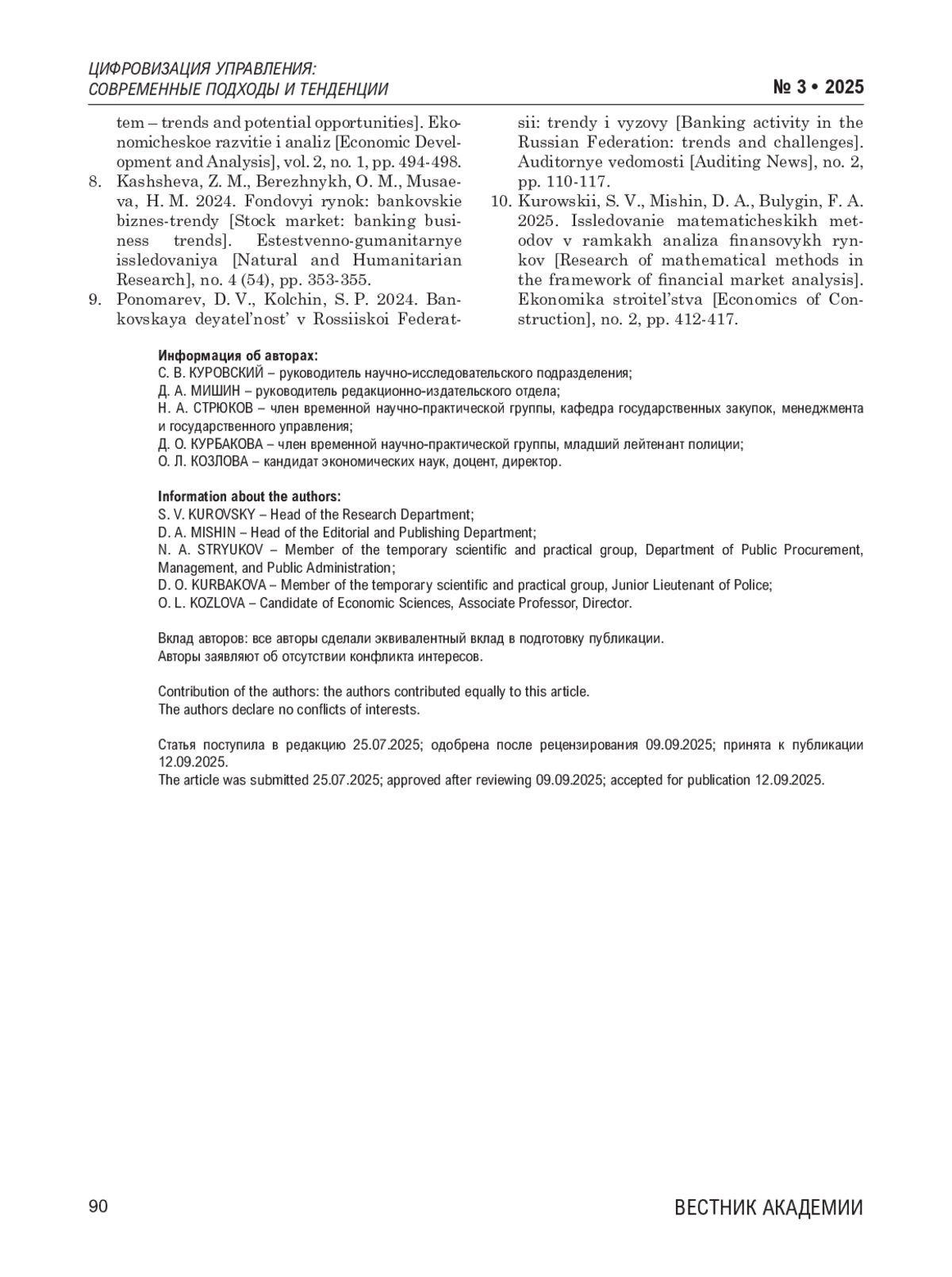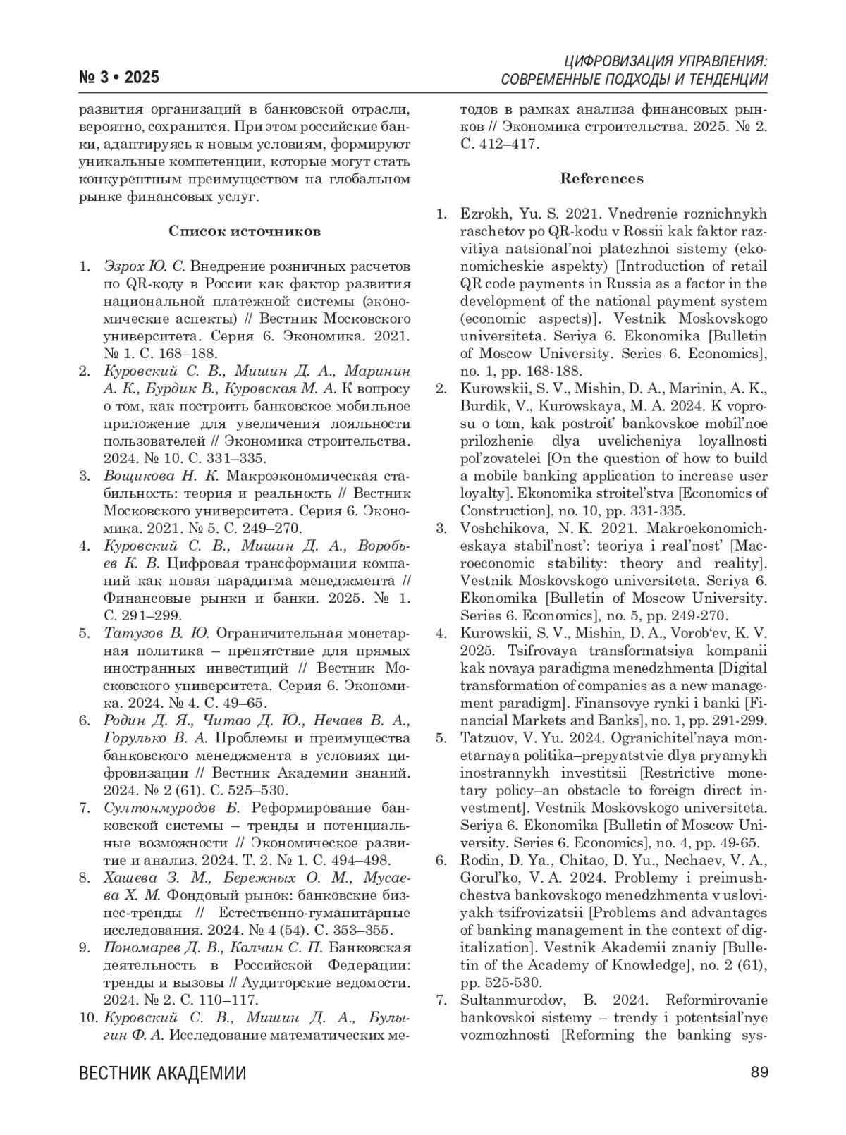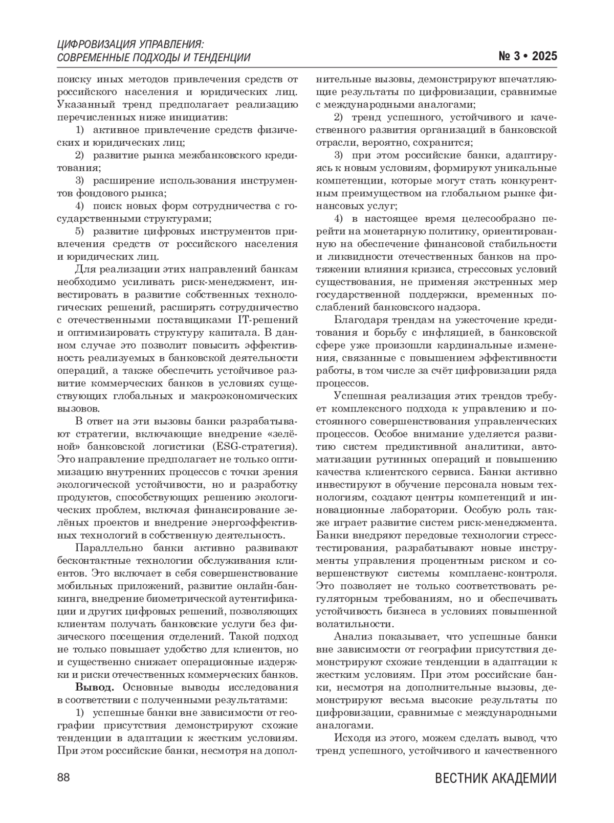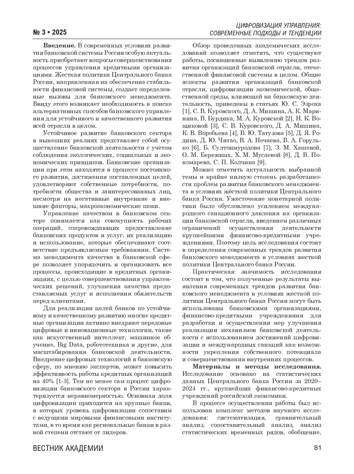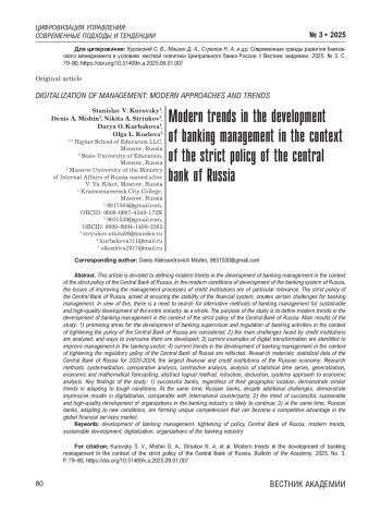 Данная статья посвящена определению современных трендов развития банковского менеджмента в условиях жесткой политики Центрального банка России. В современных условиях развития банковской системы России особую актуальность приобретают вопросы совершенствования процессов управления кредитными организациями. Жесткая политика Центрального банка России, направленная на обеспечение стабильности финансовой системы, создает определенные вызовы для банковского менеджмента. Ввиду этого возникает необходимость в поиске альтернативных способов банковского управления для устойчивого и качественного развития всей отрасли в целом. Цель исследования – определение современных трендов развития банковского менеджмента в условиях жесткой политики Центрального банка России. Основные результаты исследования: 1) рассмотрены перспективные направления развития банковского надзора и регулирования банковской деятельности в условиях ужесточения политики Центрального банка России; 2) проанализированы основные вызовы, с которыми сталкиваются кредитные организации, и выработаны пути их преодоления; 3) выявлены актуальные примеры цифровой трансформации для совершенствования управления в банковском секторе; 4) отражены актуальные тенденции развития банковского менеджмента в условиях ужесточения регуляторной политики Центрального банка России. Материалы исследования: статистические данные Центрального банка России за 2020-2024 гг., крупнейших финансово-кредитных учреждений российской экономики. Методы исследования: систематизация, сравнительный анализ, сопоставительный анализ, анализ статистических временных рядов, обобщение, экономико-математическое прогнозирование, абстрактно-логический метод, индукция, дедукция, системный подход к экономическому анализу. Основные выводы исследования: 1) успешные банки вне зависимости от географии присутствия демонстрируют схожие тенденции в адаптации к жестким условиям. При этом российские банки, несмотря на дополнительные вызовы, демонстрируют впечатляющие результаты по цифровизации, сравнимые с международными аналогами; 2) тренд успешного, устойчивого и качественного развития организаций в банковской отрасли, вероятно, сохранится; 3) при этом российские банки, адаптируясь к новым условиям, формируют уникальные компетенции, которые могут стать конкурентным преимуществом на глобальном рынке финансовых услуг.