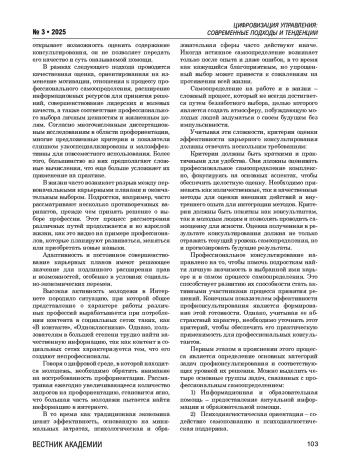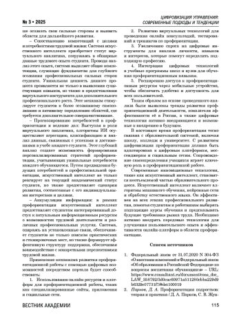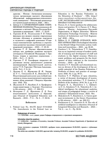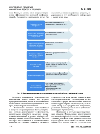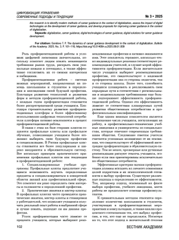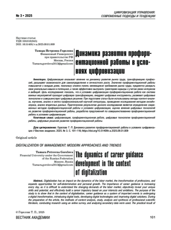 Цифровизация оказывает влияние на динамику развития рынка труда, трансформацию профессий, расширяет возможности для самоопределения и личностного роста. Значение профориентационной работы повышается с каждым днем, поскольку сложно понять меняющиеся требования рынка труда, предметно раскрыть свои уникальные навыки и потенциал, а также эффективно выстроить траекторию карьеры с учетом своих интересов и амбиций. Цель исследования: показать, что в условиях цифровизации профориентационная работа как система важных мероприятий проходит цифровую трансформацию, внедряет цифровые инструменты, развивает цифровые технологии и совершенствует цифровые решения. При подготовке статьи были использованы методы контент-анализа, изучение, анализ и синтез профессиональной научной литературы, проведение исследования методом онлайнопроса, анализ вторичных данных. Практическим результатом данного исследования является определение современных методов профориентационной работы в условиях цифровизации, оценка влияния цифровых технологий на развитие профориентационной работы, разработка предложений по совершенствованию профориентационной работы в условиях цифровизации.