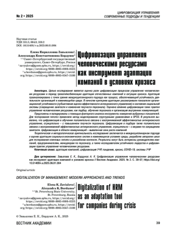 Предложены и валидированы с помощью факторного анализа инструменты измерения выбранных показателей. Для тестирования гипотез применяли метод моделирования структурными уравнениями в SPSS. В результате выявлено, что цифровизация в обучении положительно связана с воспринимаемой эффективностью антикризисного управления, отрицательно – с повышением текучести персонала. Цифровизация в подборе также положительно связана с воспринимаемой эффективностью антикризисного управления, отрицательно – с мерами по сокращению занятости. Цифровизация в области коммуникаций – выявленная зона роста компаний.
