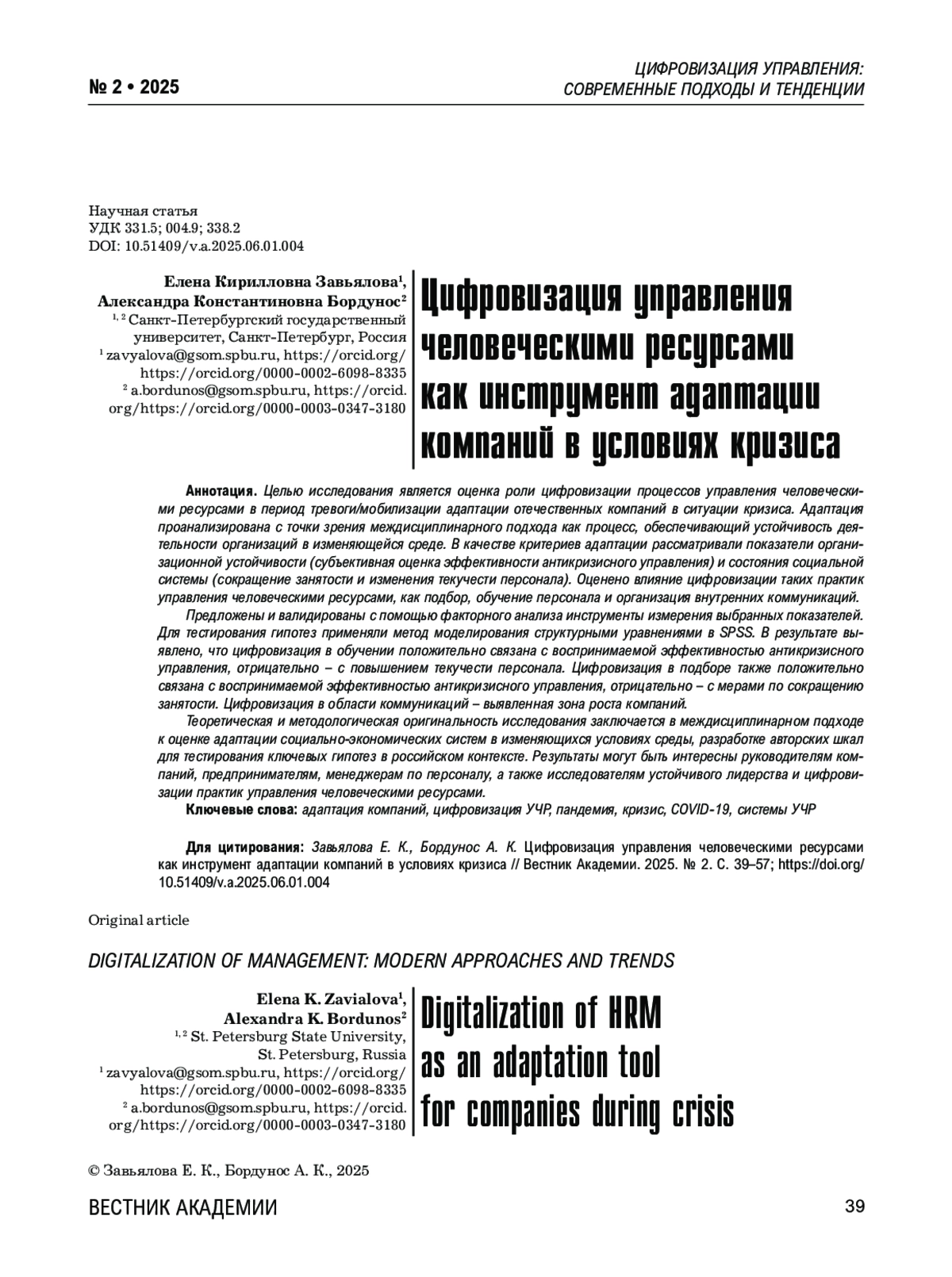 Целью исследования является оценка роли цифровизации процессов управления человеческими ресурсами в период тревоги/мобилизации адаптации отечественных компаний в ситуации кризиса. Адаптация проанализирована с точки зрения междисциплинарного подхода как процесс, обеспечивающий устойчивость деятельности организаций в изменяющейся среде. В качестве критериев адаптации рассматривали показатели организационной устойчивости (субъективная оценка эффективности антикризисного управления) и состояния социальной системы (сокращение занятости и изменения текучести персонала). Оценено влияние цифровизации таких практик управления человеческими ресурсами, как подбор, обучение персонала и организация внутренних коммуникаций.