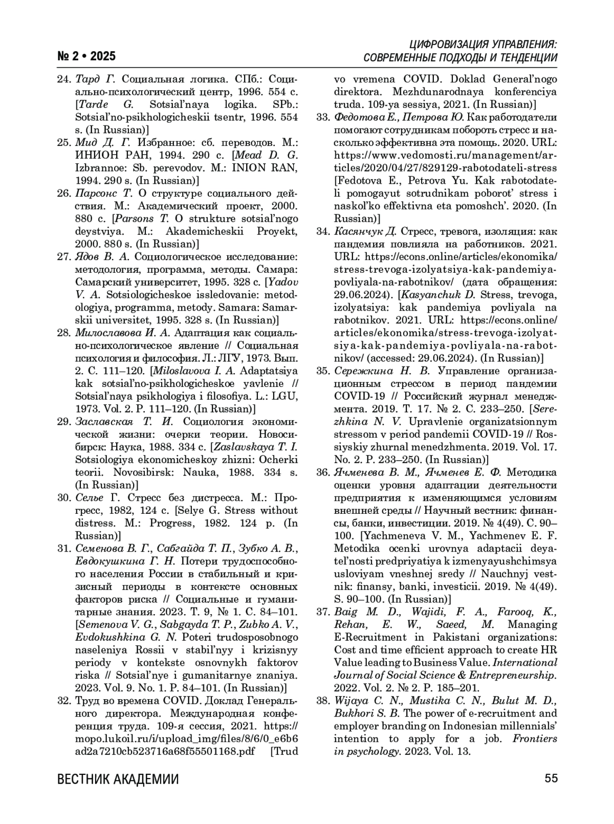 35. Сережкина Н.В. Управление организационным стрессом в период пандемии COVID-19 // Российский журнал менеджмента. 2019. Т. 17, № 2. С. 233-250. [Serezhkina N.V. Upravlenie organizatsionnym stressom v period pandemii COVID-19 // Rossiyskiy zhurnal menedzhmenta. 2019. Vol. 17, No. 2. P. 233-250. (In Russian)].