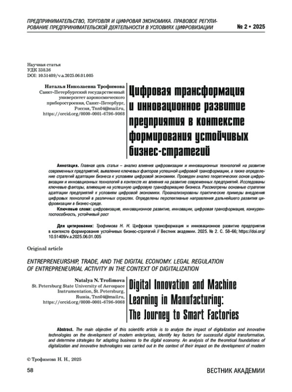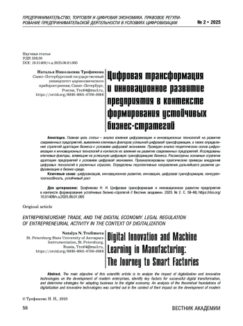 Главная цель статьи – анализ влияния цифровизации и инновационных технологий на развитие современных предприятий, выявление ключевых факторов успешной цифровой трансформации, а также определение стратегий адаптации бизнеса к условиям цифровой экономики. Проведен анализ теоретических основ цифровизации и инновационных технологий в контексте их влияния на развитие современных предприятий. Исследованы ключевые факторы, влияющие на успешную цифровую трансформацию бизнеса. Рассмотрены основные стратегии адаптации предприятий к условиям цифровой экономики. Проанализированы практические примеры внедрения цифровых технологий в различных отраслях. Определены перспективные направления дальнейшего развития цифровизации в бизнес-среде.