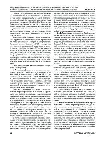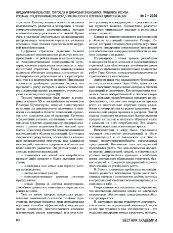 В статье рассматриваются концептуальные и прикладные аспекты использования цифровых платформ в условиях цифровизации предпринимательской деятельности. Анализируются ключевые свойства и функциональные возможности цифровых платформ, способствующие формированию новых моделей взаимодействия между участниками рынка, а также развитию предпринимательства, в которое внедрены инновации. Особое внимание уделено роли цифровых решений в изменении бизнес-процессов, повышении эффективности и снижении издержек компаний. Цель исследования заключалась в обосновании стратегического потенциала цифровых платформ как инструмента, обеспечивающего адаптацию бизнеса к условиям цифровой экономики. В статье рассказано об условиях, при которых механизмы платформ становятся основой для роста и постоянного развития компаний различных уровней— от стартапов и малого бизнеса до крупных предприятий и концернов. Практическим результатом стала разработка предложений по интеграции цифровых платформ в малый и средний бизнес, создание отраслевых платформенных решений, а также поиск подходов к поддержке экспортноориентированного предпринимательства. В статье выделены главные направления применения платформ в различных отраслях и акцентированы особенности, которые необходимо учитывать при реализации цифровых стратегий в условиях постоянных технологических изменений и частых изменений на рынке.