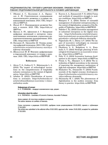 5. Нефедов И. Ю. Управление инновациями на промышленных предприятиях в условиях цифровой экономики. 2023. URL: https://cyberleninka.ru/article/n/upravlenie-inno-vatsiyami-na-promyshlennyh-predpriyati-yah-v-usloviyah-tsifrovoy-ekonomiki.