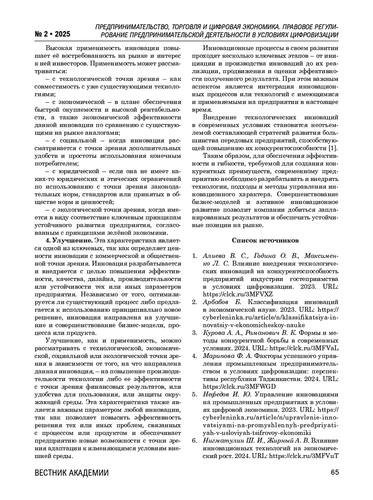 6. Нигматулин Ш. И., Жирный А. В. Влияние инновационных технологий на экономический рост. 2024. URL: https://clck.ru/3MFVuT.