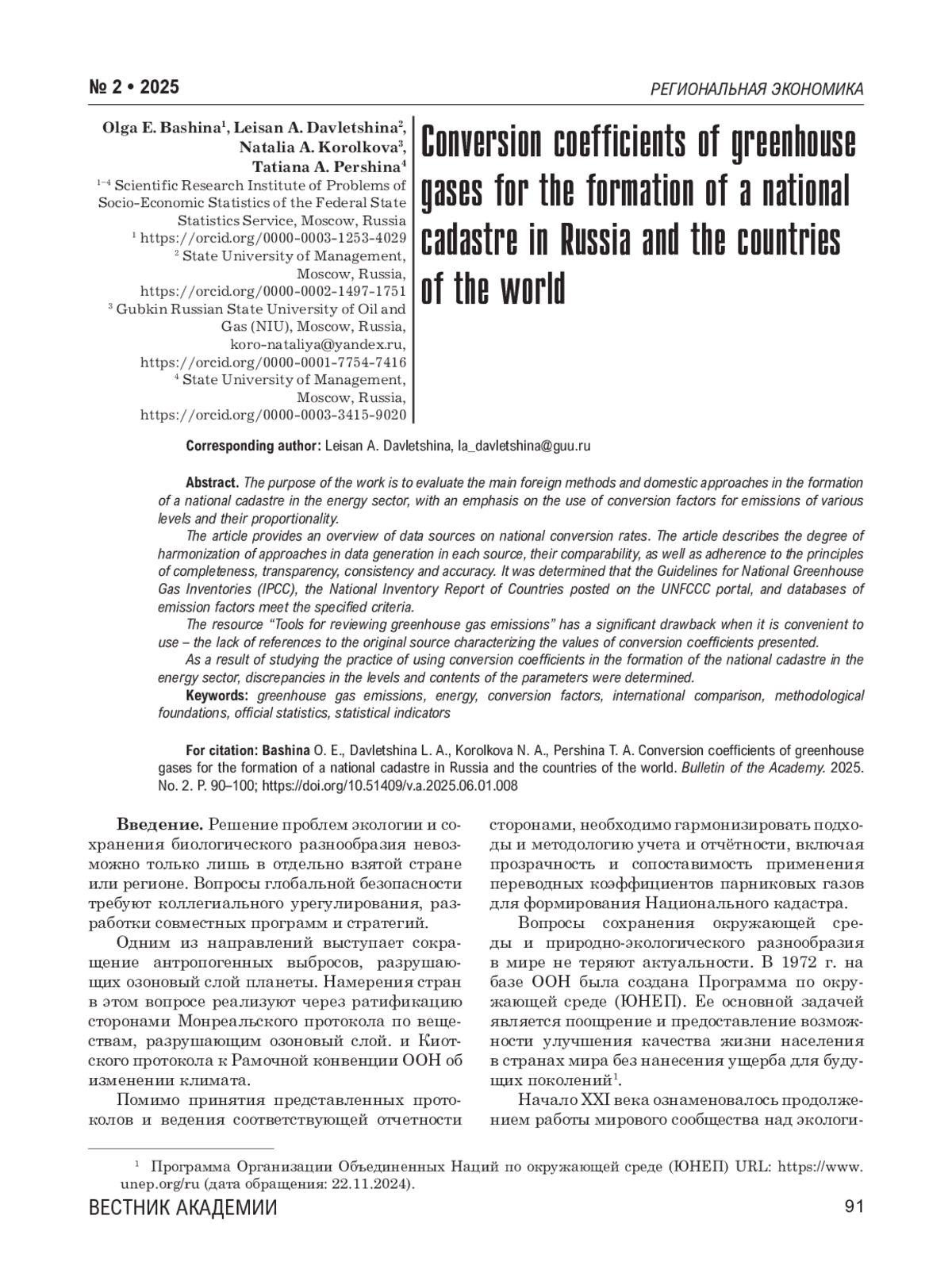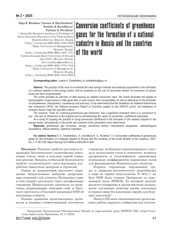 В статье проведен обзор источников данных о национальных конверсионных коэффициентах. Дана характеристика степени гармонизации подходов в формировании данных в каждом источнике, их сопоставимость, а также следование принципам полноты, транспарентности, согласованности и точности. Определено, что Руководящие принципы национальных инвентаризаций парниковых газов (МГЭИК), Национальный доклад о кадастре стран, размещенный на портале РКИК ООН, базы данных коэффициентов выбросов отвечают заданным критериям.