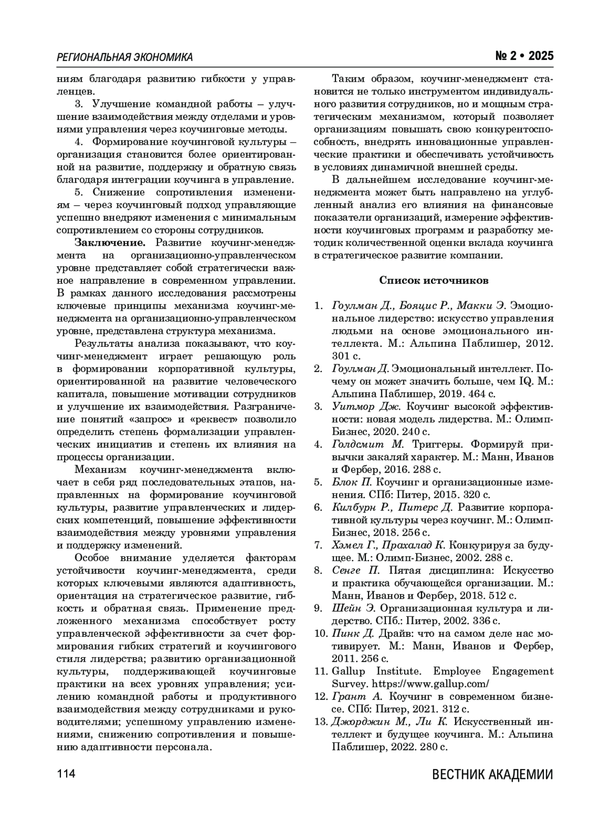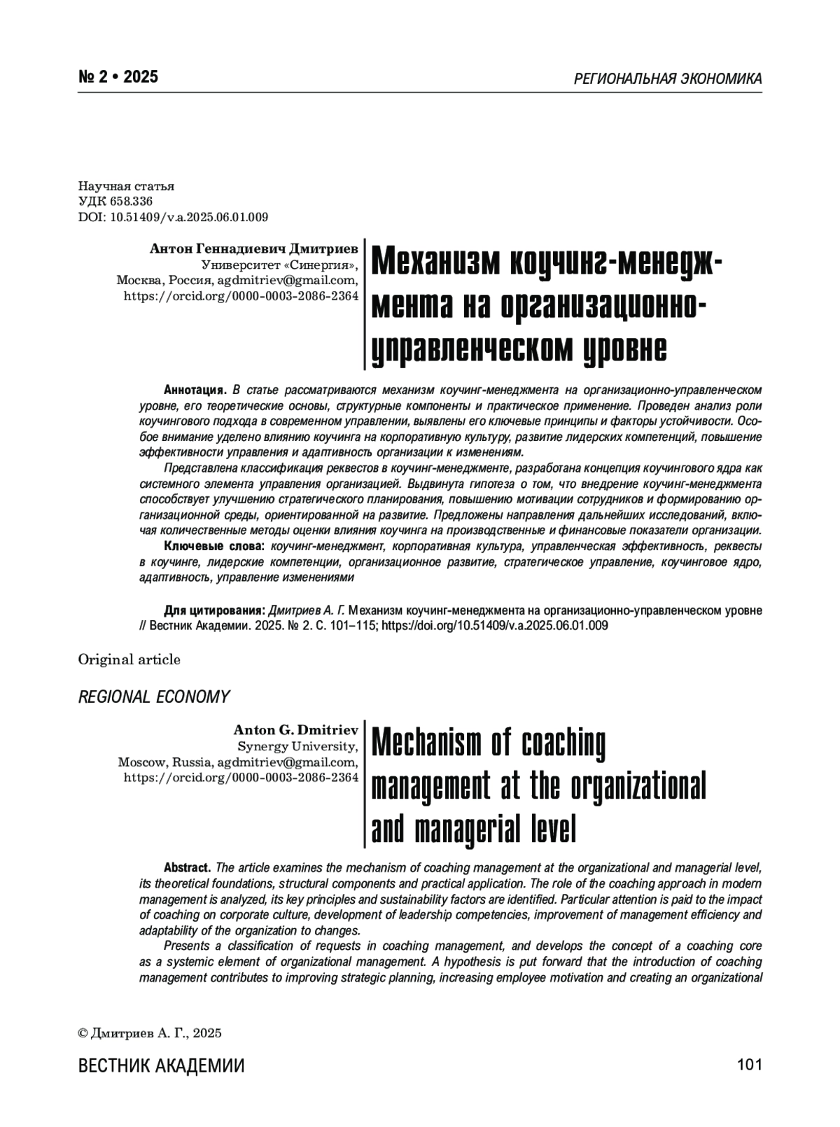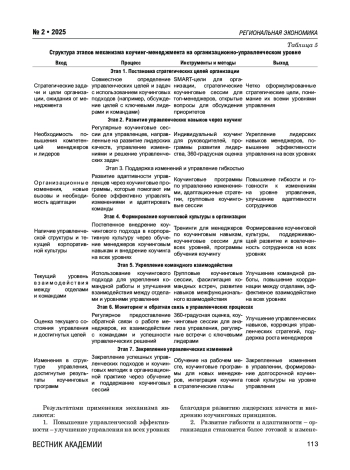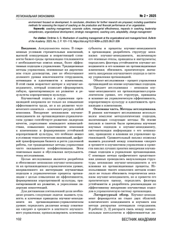 В статье рассматриваются механизм коучинг-менеджмента на организационно-управленческом уровне, его теоретические основы, структурные компоненты и практическое применение. Проведен анализ роли коучингового подхода в современном управлении, выявлены его ключевые принципы и факторы устойчивости. Особое внимание уделено влиянию коучинга на корпоративную культуру, развитие лидерских компетенций, повышение эффективности управления и адаптивность организации к изменениям.