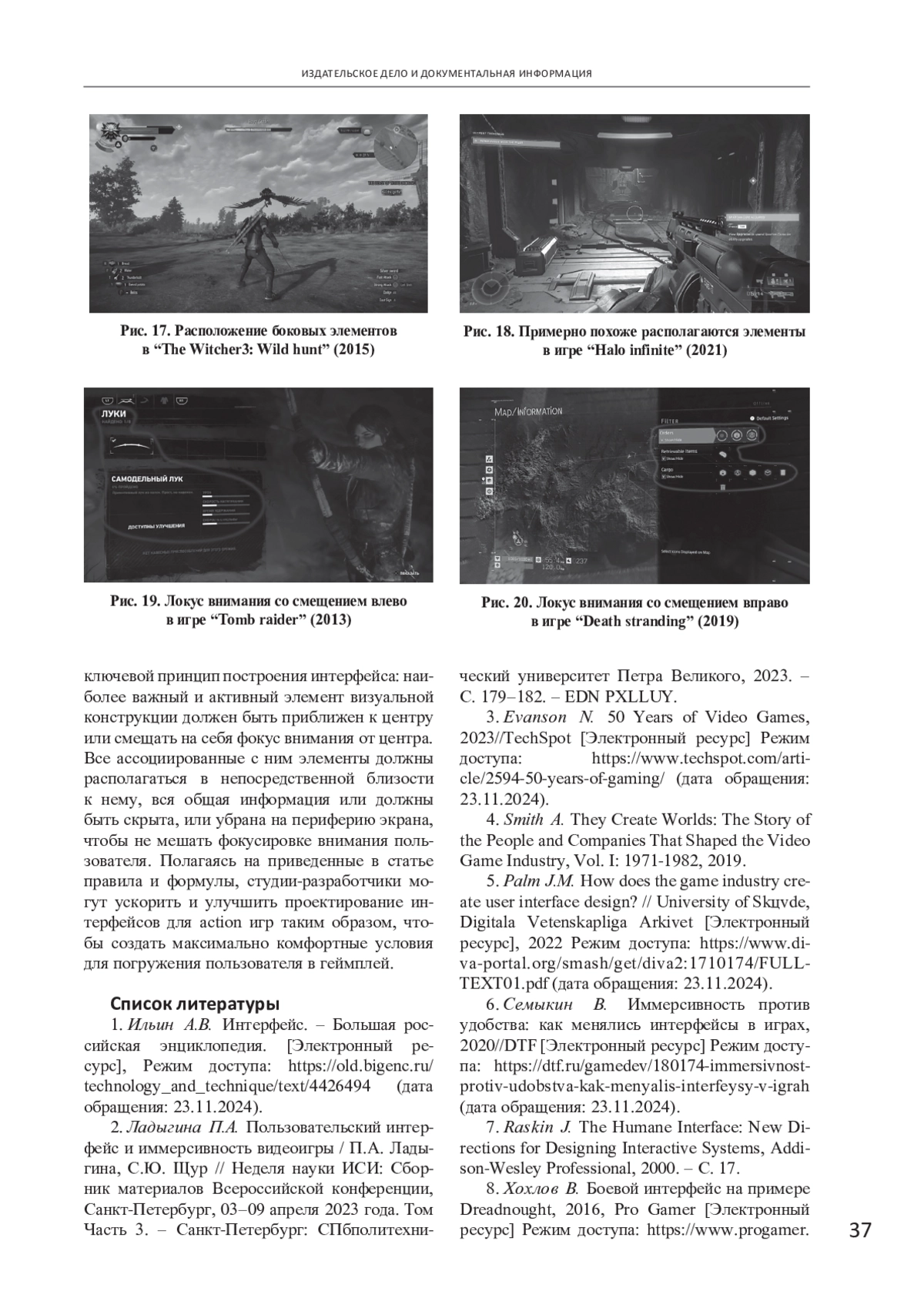 2. Ладыгина П.А. Пользовательский интерфейс и иммерсивность видеоигры / П.А. Ладыгина, С.Ю. Щур // Неделя науки ИСИ: Сборник материалов Всероссийской конференции, Санкт-Петербург, 03-09 апреля 2023 года. Том Часть 3. - Санкт-Петербург: СПбполитехнический университет Петра Великого, 2023. - С. 179-182. EDN: PXLLUY