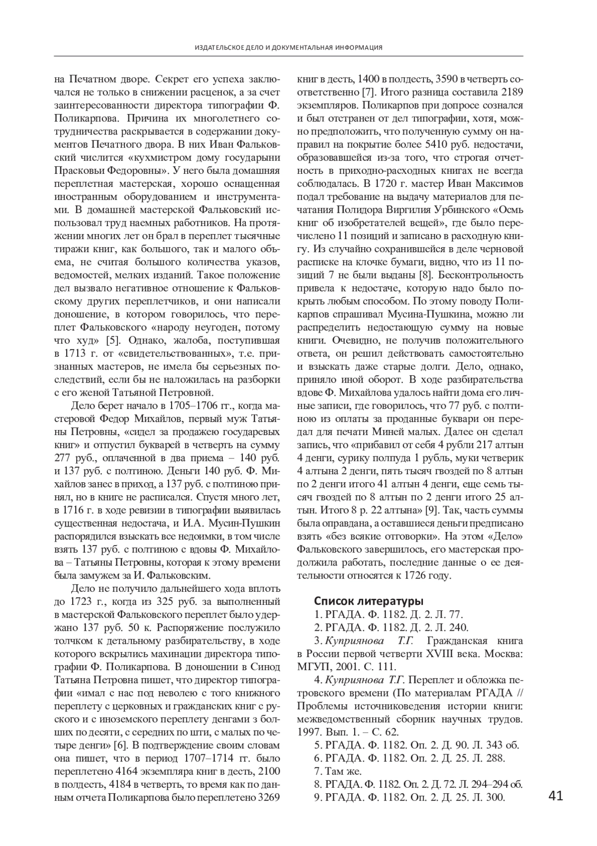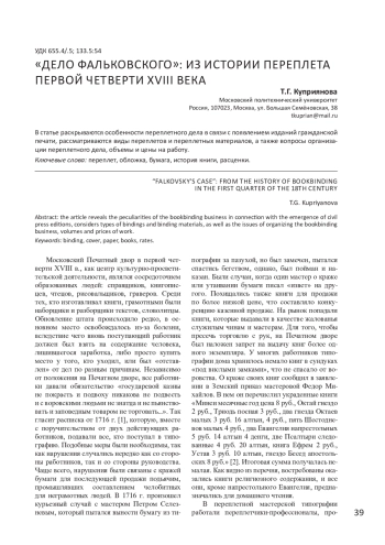 КУПРИЯНОВА Т. Г. "ДЕЛО ФАЛЬКОВСКОГО": ИЗ ИСТОРИИ ПЕРЕПЛЕТА ПЕРВОЙ ЧЕТВЕРТИ ХVIII ВЕКА // ИЗВЕСТИЯ ВЫСШИХ УЧЕБНЫХ ЗАВЕДЕНИЙ. ПРОБЛЕМЫ ПОЛИГРАФИИ И ИЗДАТЕЛЬСКОГО ДЕЛА. 2025. № 1