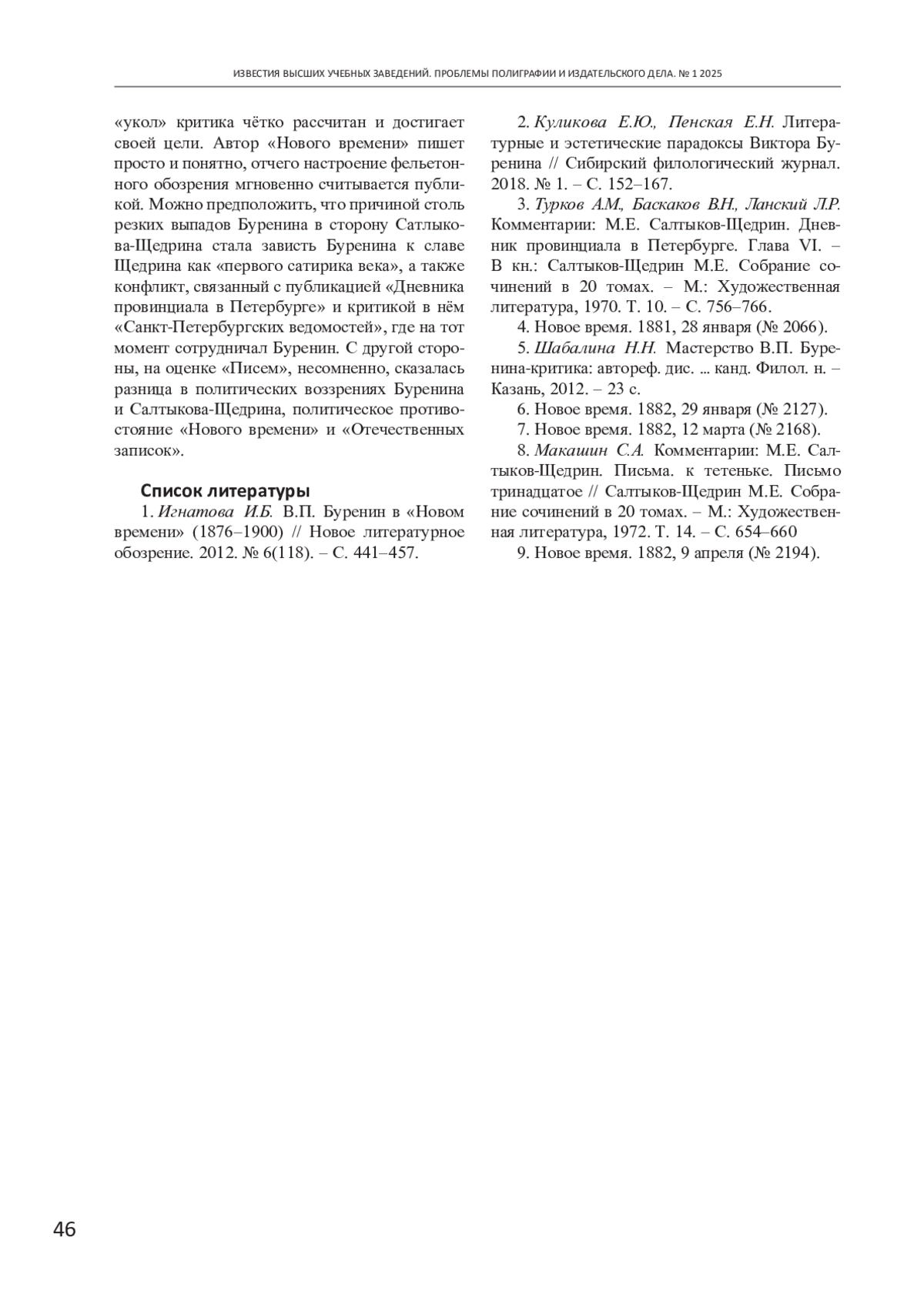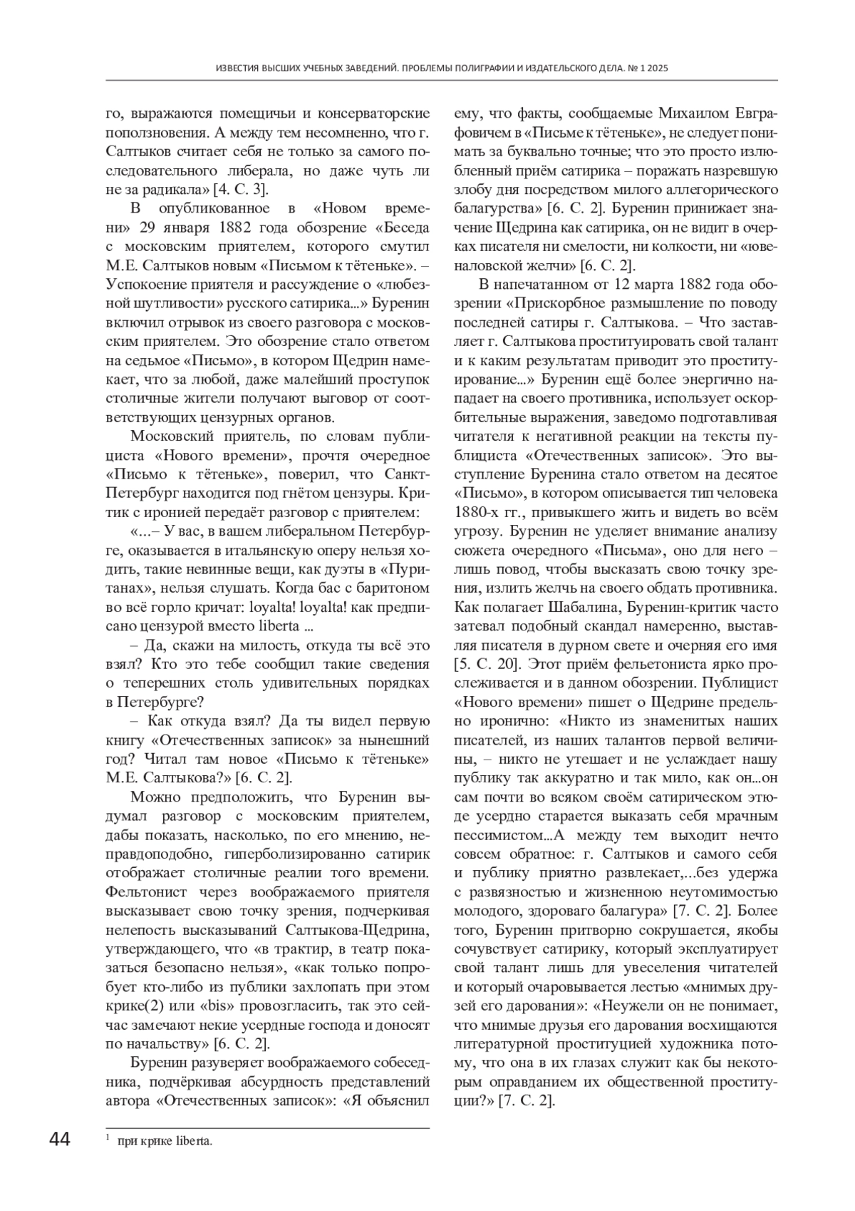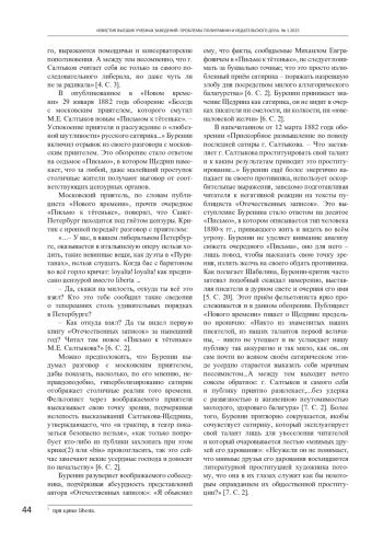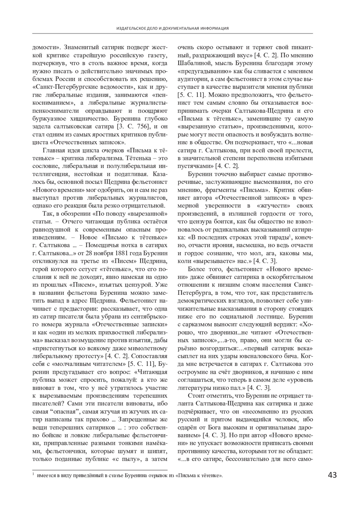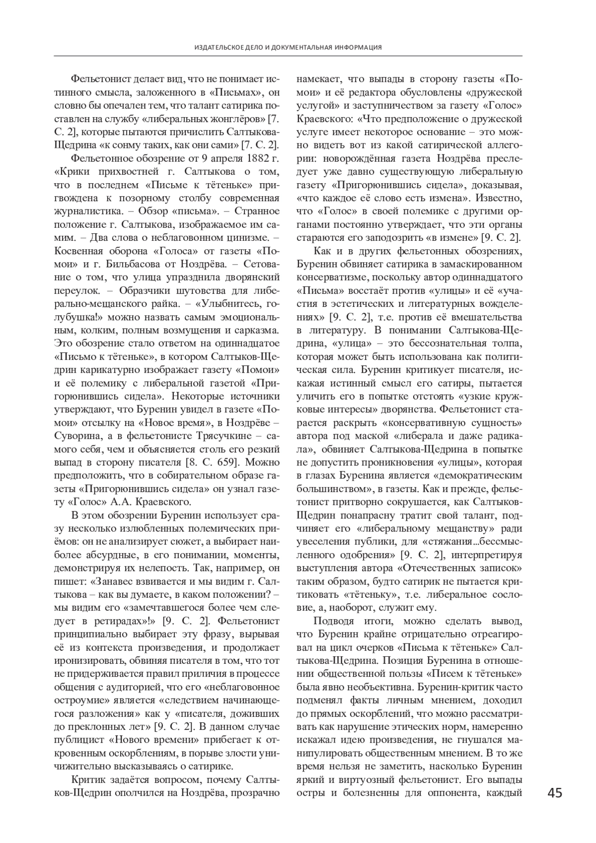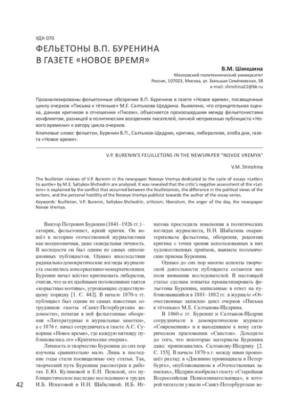 Проанализированы фельетонные обозрения В. П. Буренина в газете «Новое время», посвященные циклу очерков «Письма к тётеньке» М. Е. Салтыкова-Щедрина. Выявлено, что отрицательная оценка, данная критиком в отношении «Писем», объясняется произошедшим между фельетонистами конфликтом, разницей в политических воззрениях писателей, личной неприязнью публициста «Нового времени» к автору цикла очерков.