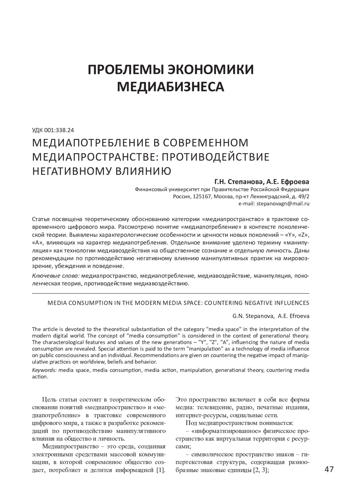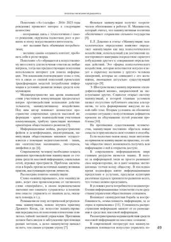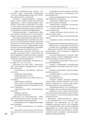 Статья посвящена теоретическому обоснованию категории «медиапространство» в трактовке современного цифрового мира. Рассмотрено понятие «медиапотребление» в контексте поколенческой теории. Выявлены характерологические особенности и ценности новых поколений - «Y», «Z», «A», влияющих на характер медиапотребления. Отдельное внимание уделено термину «манипуляция» как технологии медиавоздействия на общественное сознание и отдельную личность. Даны рекомендации по противодействию негативному влиянию манипулятивных практик на мировоззрение, убеждения и поведение.