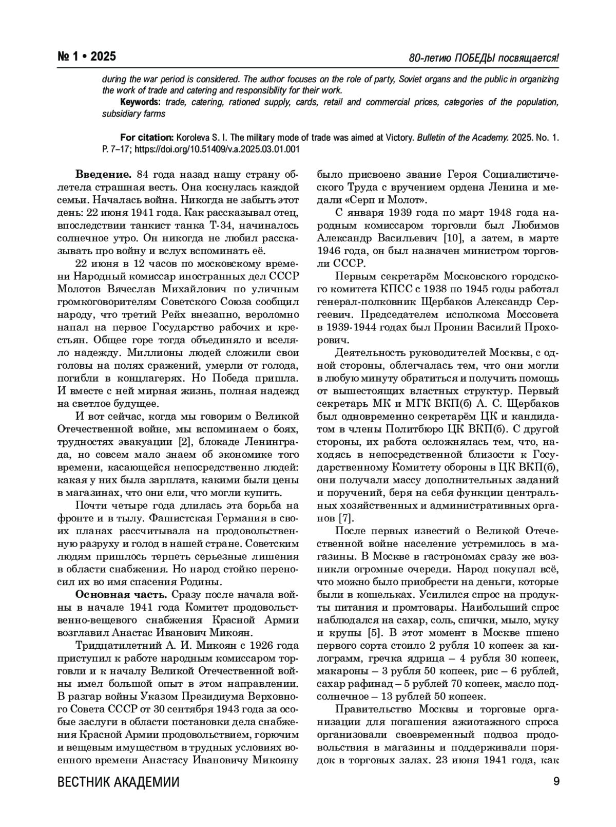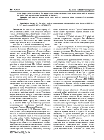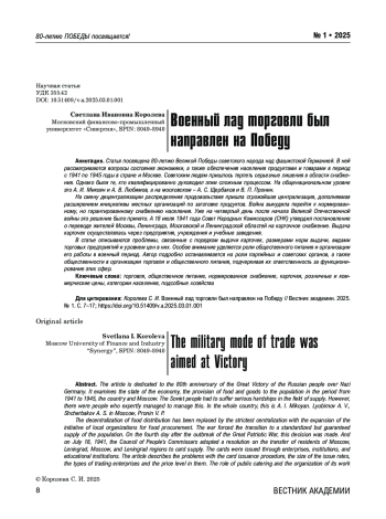 Статья посвящена 80-летию Великой Победы советского народа над фашистской Германией. В ней рассматриваются вопросы состояния экономики, а также обеспечения населения продуктами и товарами в период с 1941 по 1945 годы в стране и Москве. Советским людям пришлось терпеть серьезные лишения в области снабжения. Однако были те, кто квалифицированно руководил этим сложным процессом. На общенациональном уровне это А. И. Микоян и А. В. Любимов, а на московском – А. С. Щербаков и В. П. Пронин.