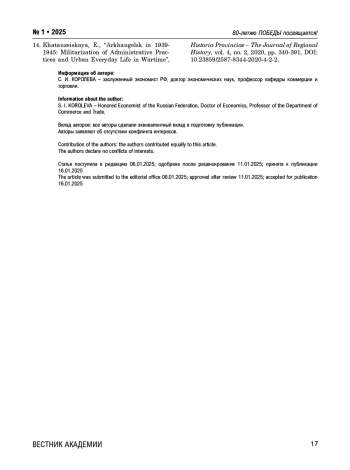 14. Khatanzeiskaya E. Arkhangelsk in 1939-1945: Militarization of Administrative Practices and Urban Everyday Life in Wartime. Historia Provinciae - The Journal of Regional History, vol. 4, no. 2 (2020): 340-91.