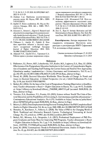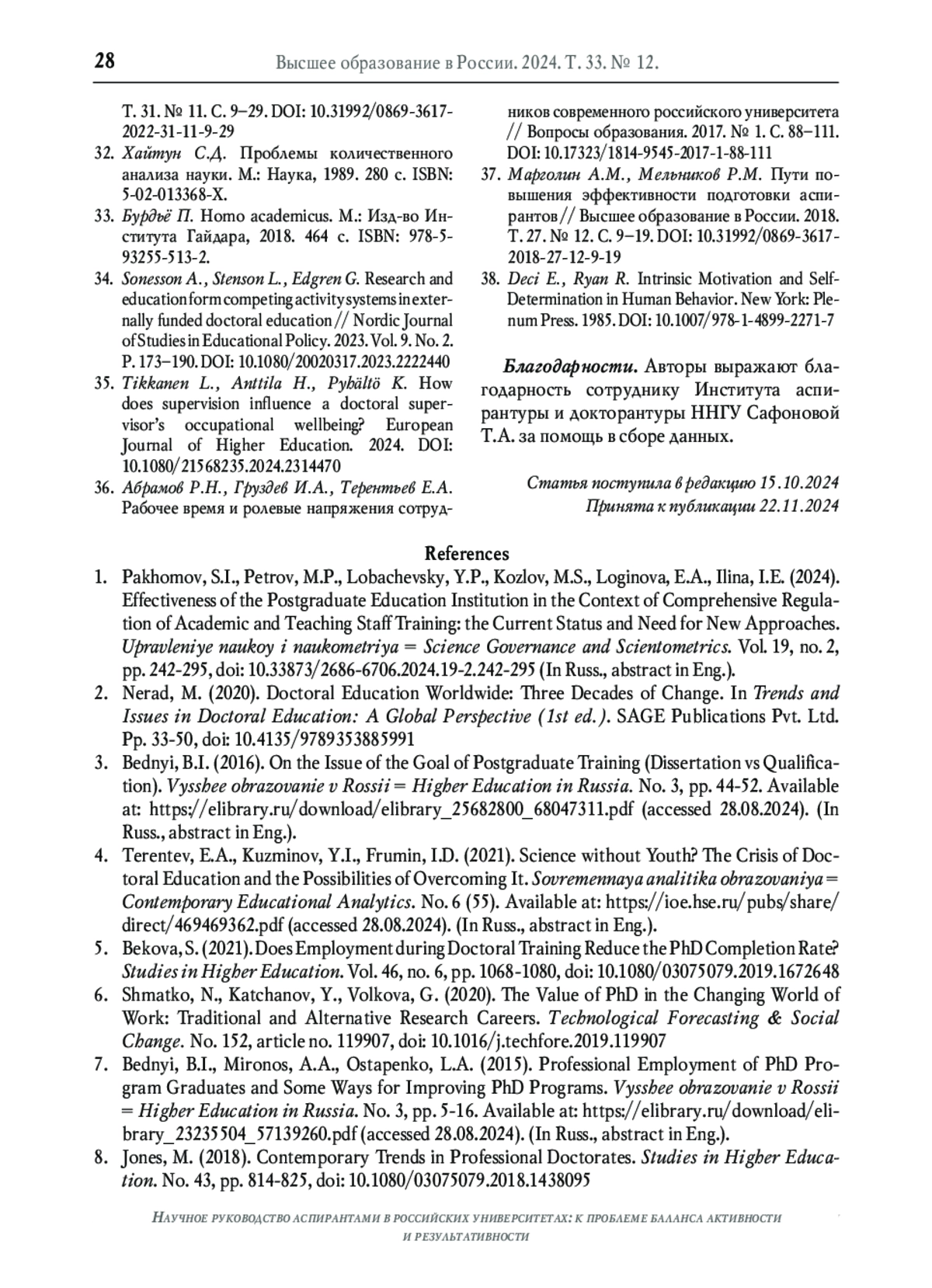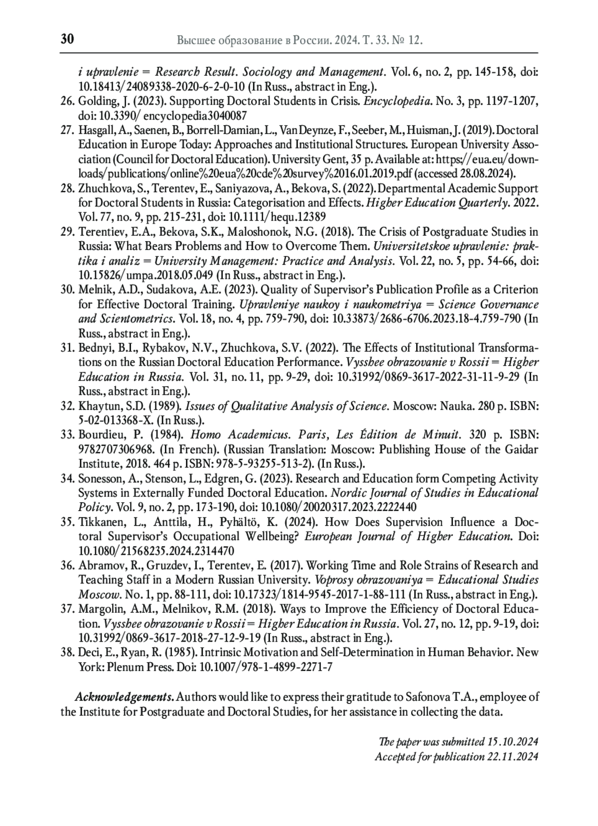 28. Zhuchkova S., Terentev E., Saniyazova A., Bekova S. Departmental academic support for doctoral students in Russia: Categorisation and effects // Higher Education Quarterly. 2022. Vol. 77. No. 9. P. 215-231. DOI: 10.1111/hequ.12389 EDN: QDUJWN
