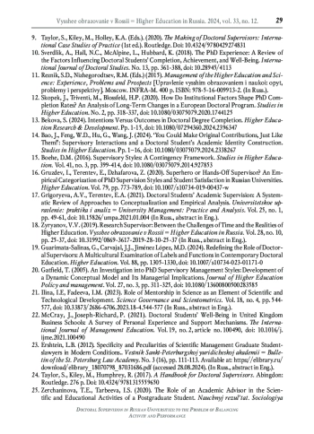 9. Taylor S., Kiley M., Holley K.A. (Eds.). The Making of Doctoral Supervisors: International Case Studies of Practice (1st ed.). Routledge. 2020. DOI: 10.4324/9780429274831