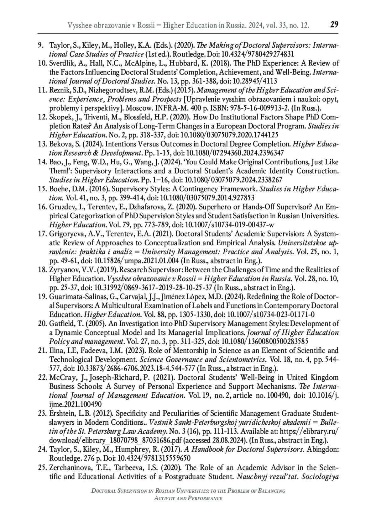 16. Gruzdev I., Terentev E., Dzhafarova Z. Superhero or hands-off supervisor? An empirical categorization of PhD supervision styles and student satisfaction in Russian universities // Higher Education. 2020. Vol. 79. P. 773-789. DOI: 10.1007/s10734-019-00437-w EDN: VNTTHJ